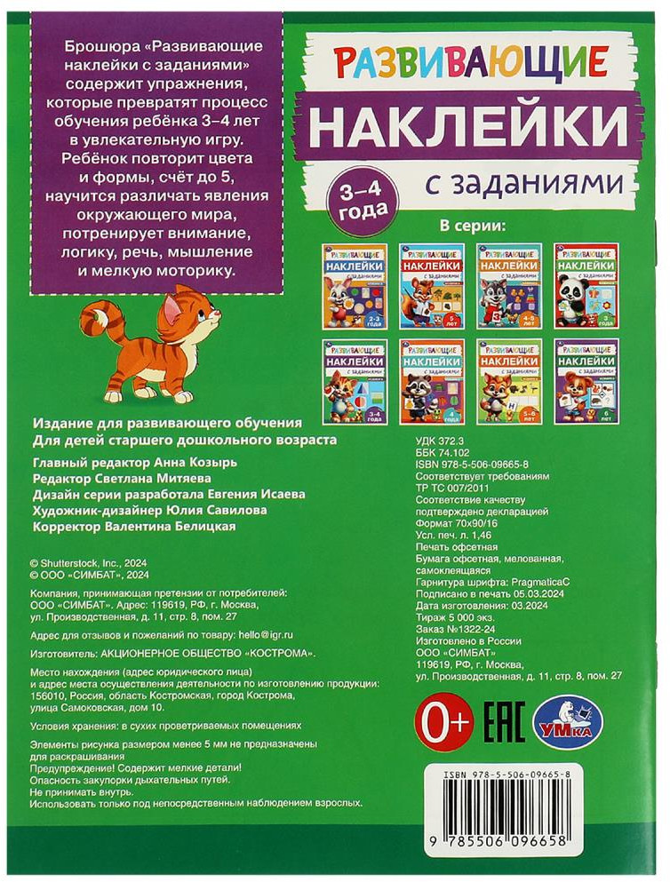 💳 Оплатить за товар можно при получении 🇰🇿 Есть бесплатная доставка по Казахстану 🎁 Копите бонусы с каждой покупки Брошюра «Развивающие наклейки с заданиями» ТМ «УМка» непременно понравится маленьким любознайкам. Данная брошюра содержит упражнения, которые превратят процесс обучения ребёнка 3 - 4 лет в увлекательную игру. Ребёнок повторит цвета и формы, счёт до 5. научится различать явления окружающего мира, потренирует внимание, логику, речь, мышление и мелкую моторику. |