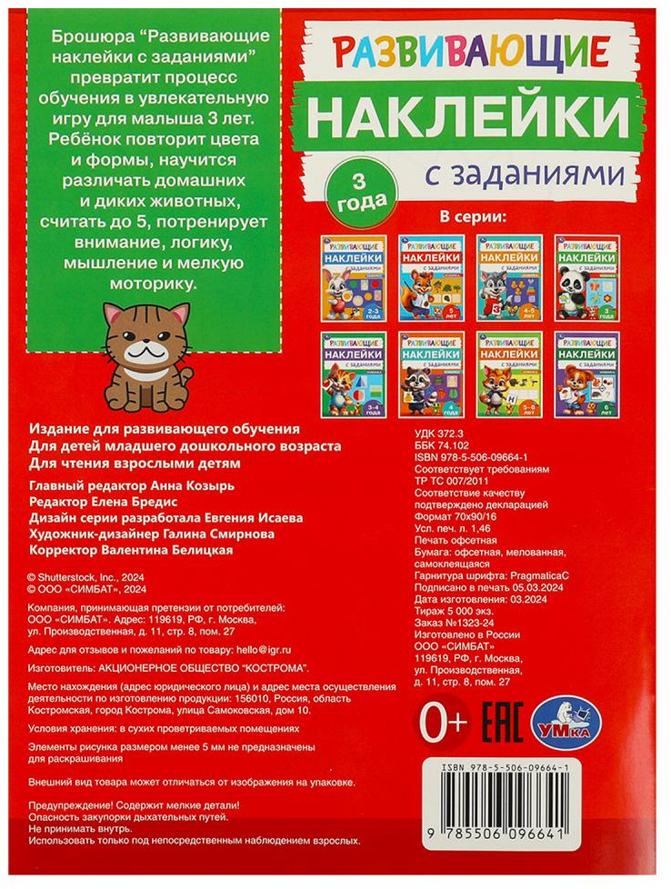💳 Оплатить за товар можно при получении 🇰🇿 Есть бесплатная доставка по Казахстану от 1 дня 🎁 Копите бонусы с каждой покупки Брошюра «Развивающие наклейки с заданиями» ТМ «УМка» непременно понравится маленьким любознайкам. Данная брошюра содержит упражнения, которые превратят процесс обучения малыша 3-х лет в увлекательную игру. Ребёнок повторит цвета и формы, научится различать домашних и диких животных, считать до 5, потренирует внимание, логику, мышление и мелкую моторику. |