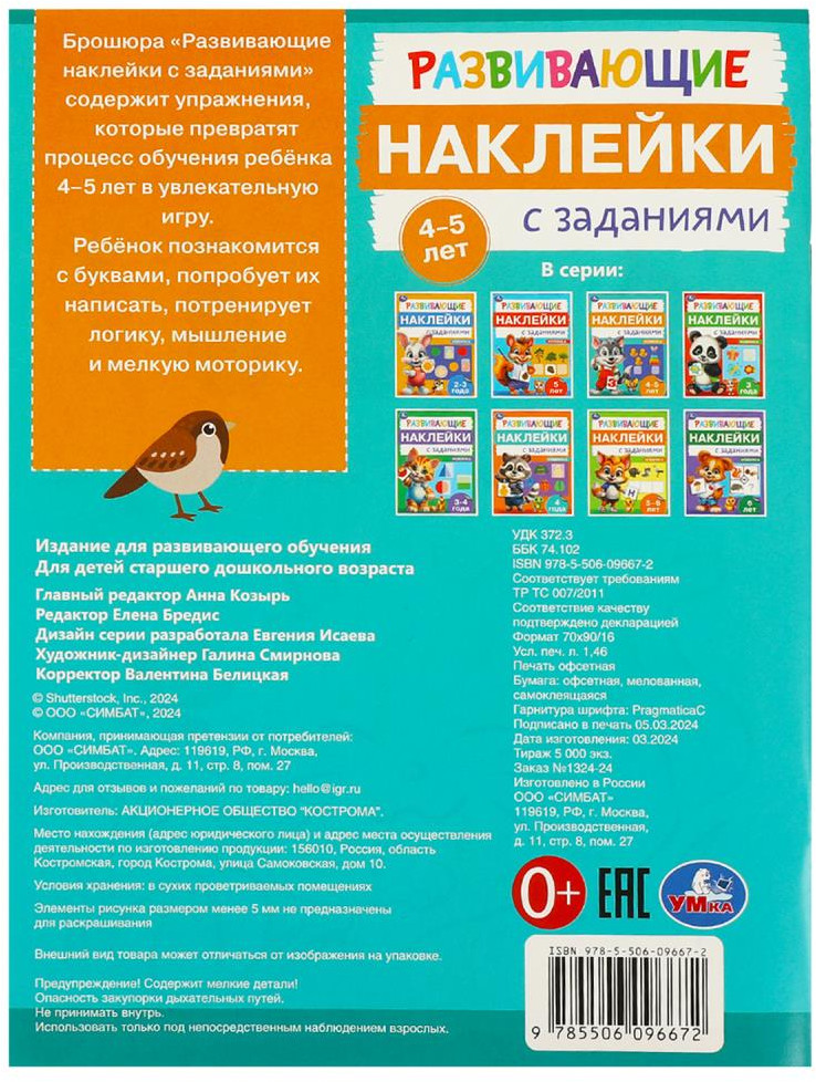 💳 Оплатить за товар можно при получении 🇰🇿 Есть бесплатная доставка по Казахстану от 1 дня 🎁 Копите бонусы с каждой покупки Брошюра «Развивающие наклейки с заданиями» ТМ «УМка» непременно понравится маленьким любознайкам. Данная брошюра содержит упражнения, которые превратят процесс обучения ребёнка 4 - 5 лет в увлекательную игру. Ребёнок познакомится с буквами, попробует их написать, потренирует логику, мышление и мелкую моторику. |