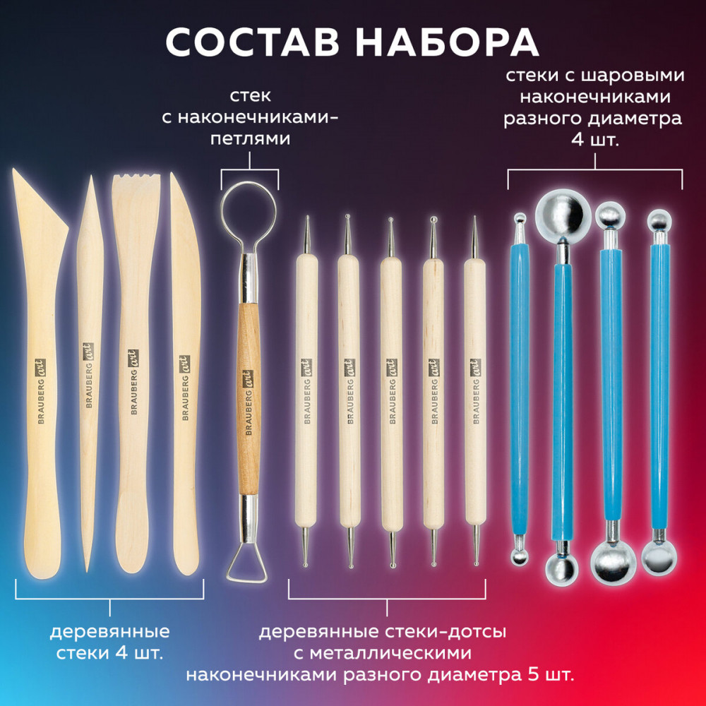 Инструменты для лепки и моделирования помогут создать шедевр при занятиях лепкой как новичку, так и профессионалу. Предназначены для работы с глиной, пластилином (скульптурным и обычным), гипсом, мастикой или же воском. В набор входит 14 инструментов для лепки, самых разнообразных по форме и размеру, из дерева и металла. Инструменты подойдут для декорирования, моделирования и лепки из всевозможных материалов. С их помощью можно добиться точности в работе до мельчайших деталей, которую не добьешься руками.