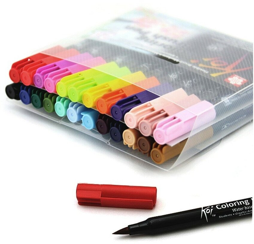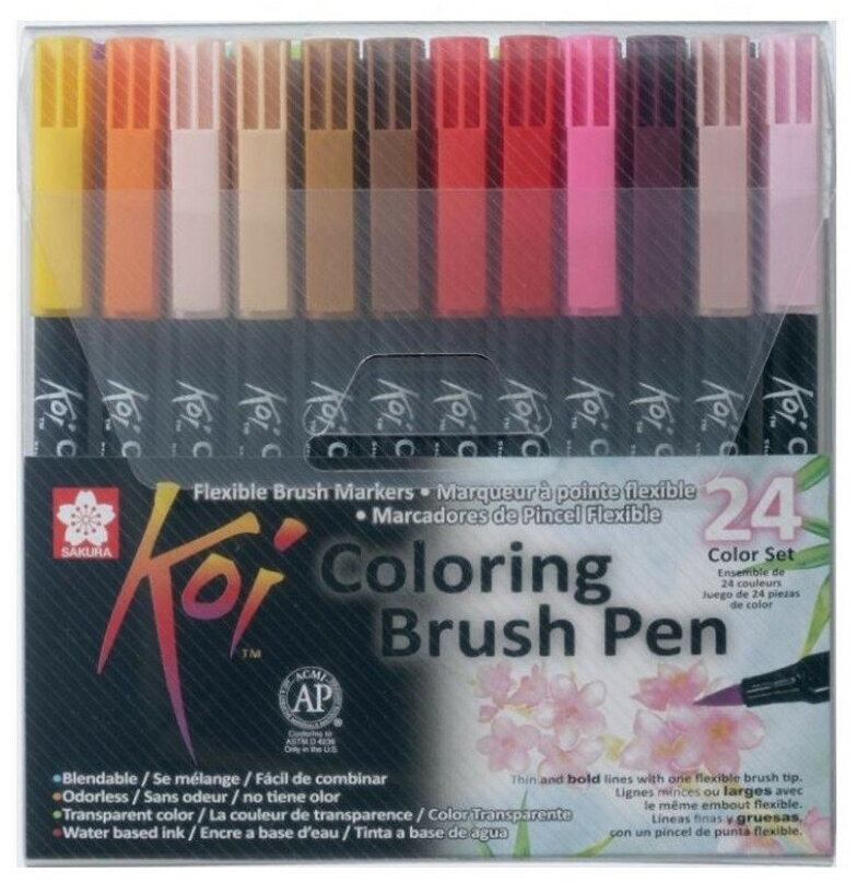 В ассортимент «Sakura» входят самые разные художественные ручки и маркеры, а также сопутствующие им товары, такие как краски и бумага. Удачное сочетание эксклюзивных дизайнерских решений и высококачественного материала делают продукцию этого бренда одной из самых популярных в мире. Вся продукция «Sakura» прошла сертификацию в соответствии со стандартами токсической безопасности, и ее можно смело рекомендовать и взрослым, и детям. Акварельные односторонние маркеры (Coloring Brush Pens) KOI от известного японского бренда Sakura. Гибкий нейлоновый наконечник «кисть» позволяет менять толщину линии за счет силы нажатия. Водные чернила на основе красителей не имеют запаха.