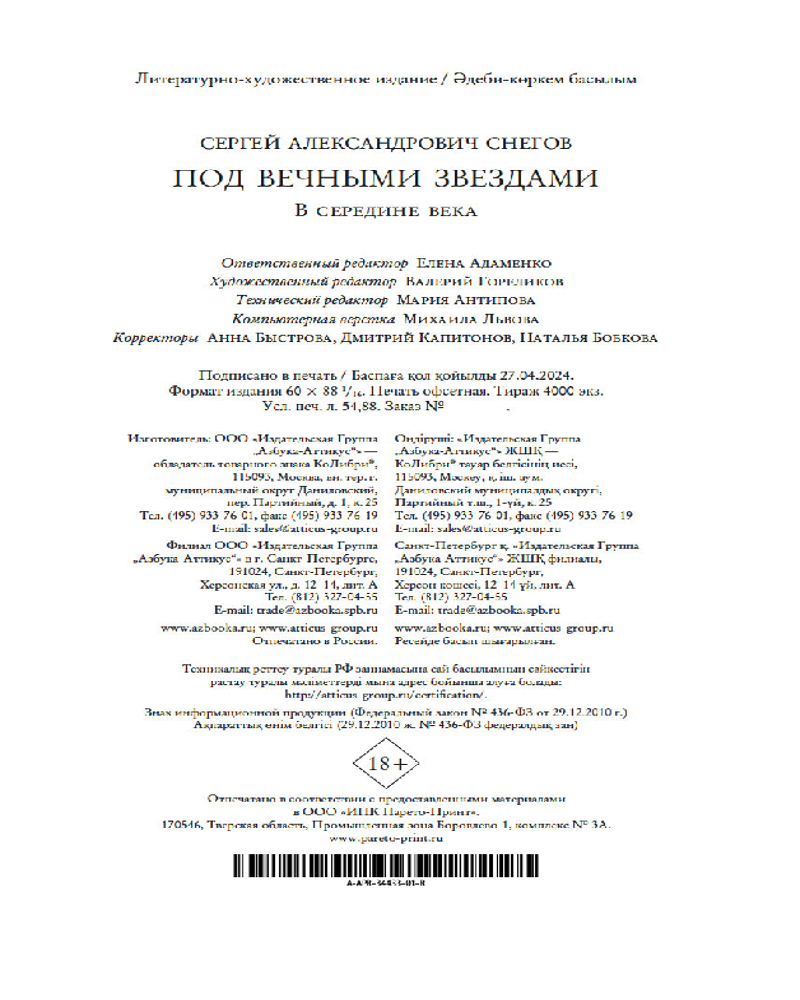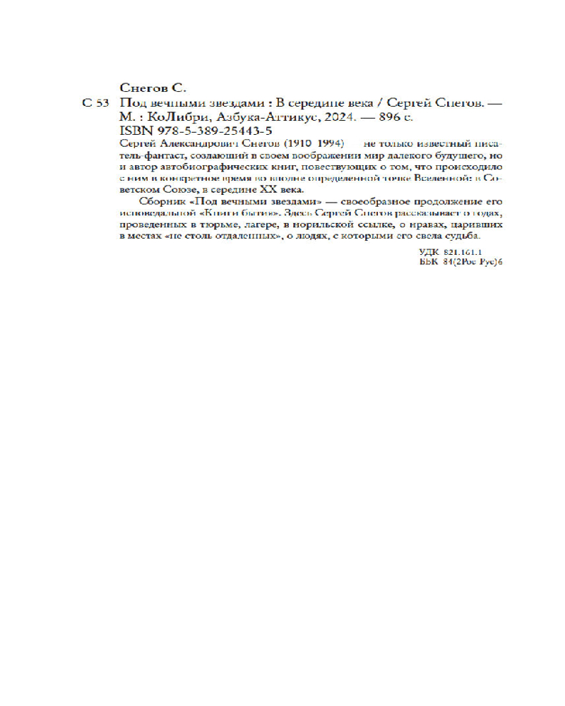 💳 Оплатить за товар можно при получении 🇰🇿 Есть бесплатная доставка по Казахстану от 1 дня 🎁 Копите бонусы с каждой покупки Серия: Персона Сергей Александрович Снегов (1910-1994) — не только известный писатель-фантаст, создающий в своем воображении мир далекого будущего, но и автор автобиографических книг, повествующих о том, что происходило с ним в конкретное время во вполне определенной точке Вселенной: в Советском Союзе, в середине XX века. Сборник «Под вечными звездами» — своеобразное продолжение его исповедальной «Книги бытия». Здесь Сергей Снегов рассказывает о годах, проведенных в тюрьме, лагере, в норильской ссылке, о нравах, царивших в местах «не столь отдаленных», о людях, с которыми его свела судьба. |