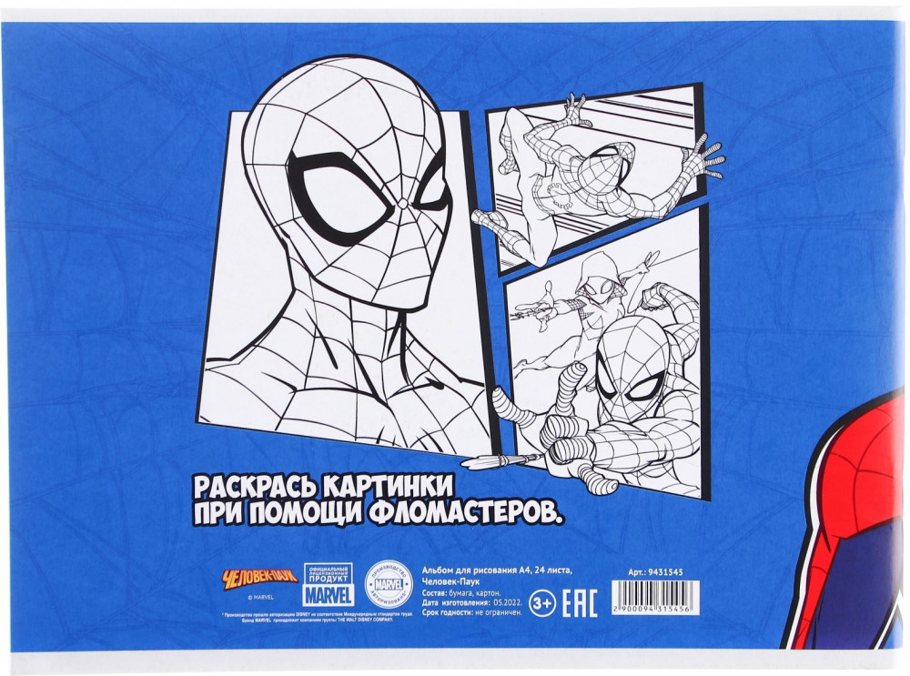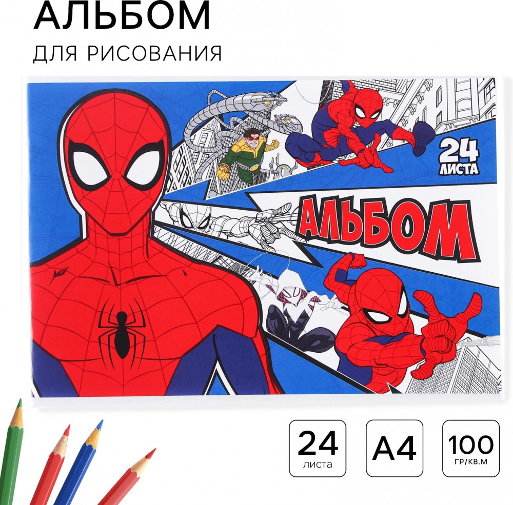 Marvel Альбом для рисования «Человек-паук»В данный момент этот товар отсутствует в продаже. Возможно, у нас найдется аналогичный или похожий товар здесь. Альбом серии «Человек-паук» подходит для уроков рисования в школе, развивающих кружков и мастер-классов. Альбом также можно использовать для создания скетчей (зарисовок). Красочная обложка с популярными персонажами изготовлена из картона с полноцветной печатью. Внутри 24 листа бумаги плотностью 100 г/м². Листы зафиксированы на стальной скрепке. Такая бумага не просвечивает и подходит для рисования в различных техниках: |
