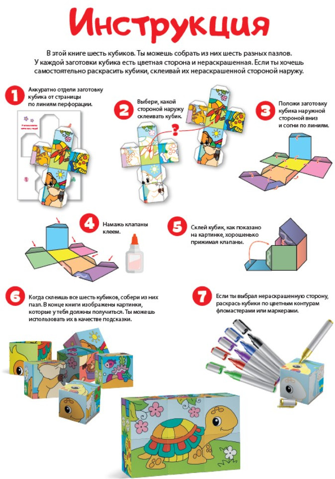 💳 Оплатить за товар можно при получении 🇰🇿 Есть бесплатная доставка по Казахстану от 1 дня 🎁 Копите бонусы с каждой покупки Серия: Занимательный блокнот Кубики-пазлы для детей из картона — это игровой набор с элементами детского творчества. Из кубиков можно собрать 6 пазлов с яркими тематическими картинками. В наборе 6 листов из плотного картона с вырубкой для извлечения заготовок кубиков. Каждая заготовка имеет 2 стороны. Ребенок сможет выбрать, какой стороной собрать кубик — яркой или с цветными контурами для самостоятельного раскрашивания. В комплекте есть инструкция, по которой ребенок сам сможет собрать каждый кубик. Для сборки ему понадобится только клей! Благодаря плотному картону (230 г/м) кубики держат форму и прослужат долго. Увлекательная развивающая игра для детей от 3 лет развивает усидчивость, мелкую моторику рук и воображение. |
