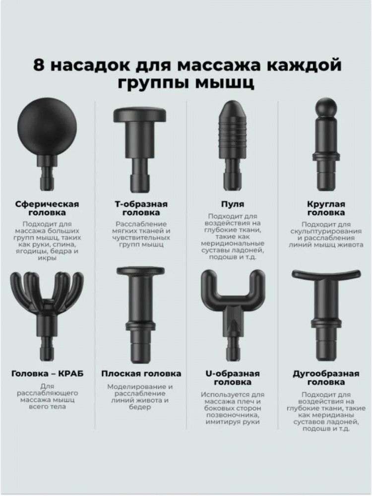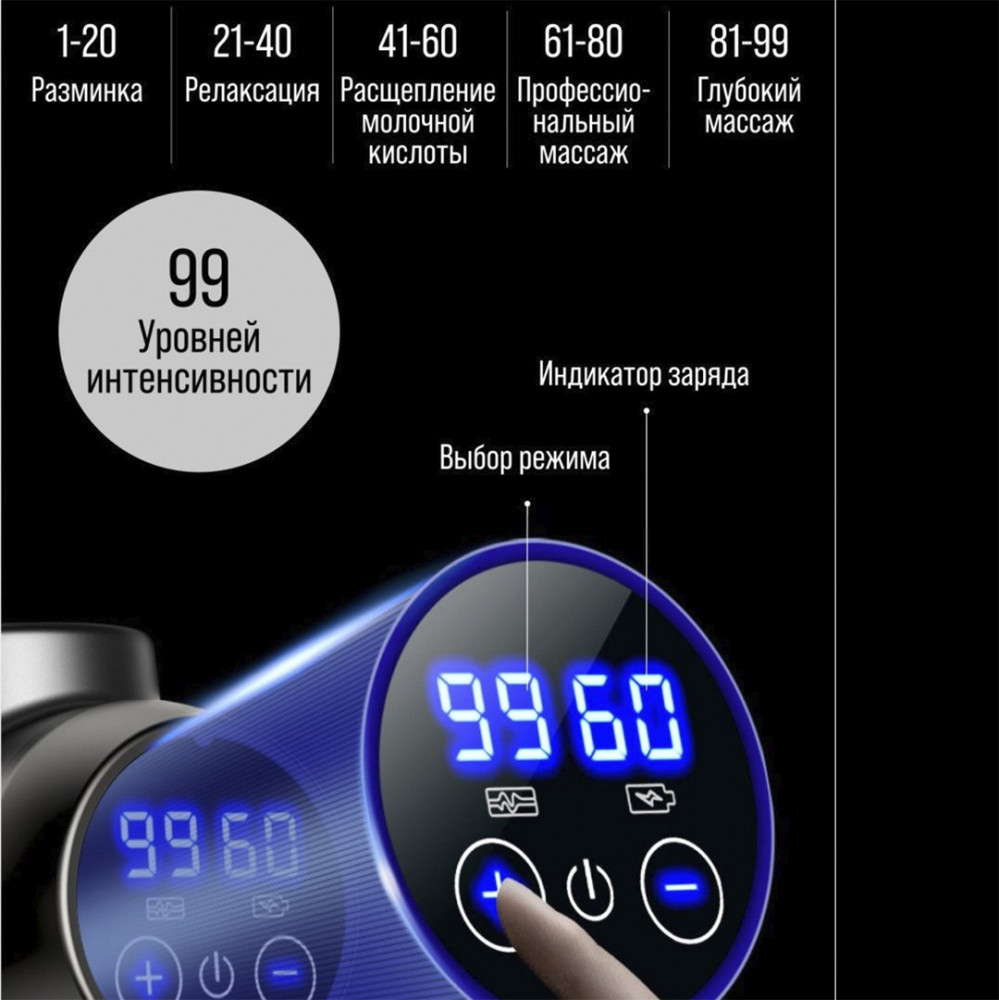 Перкуссионный массажер имеет 99 скоростей с бесступенчатым переключением для проработки мышц и фасций. В комплекте 8 насадок. Уровень шума до 45 дБ и ёмкость аккумулятора 2400 мАч. Глубина перкуссии 8 мм, скорость вращения двигателя до 9800 оборотов. Массажер вибрационный предназначен для глубокой проработки мышц вашего тела — плечи, спина, руки, шеи, ног, лица.