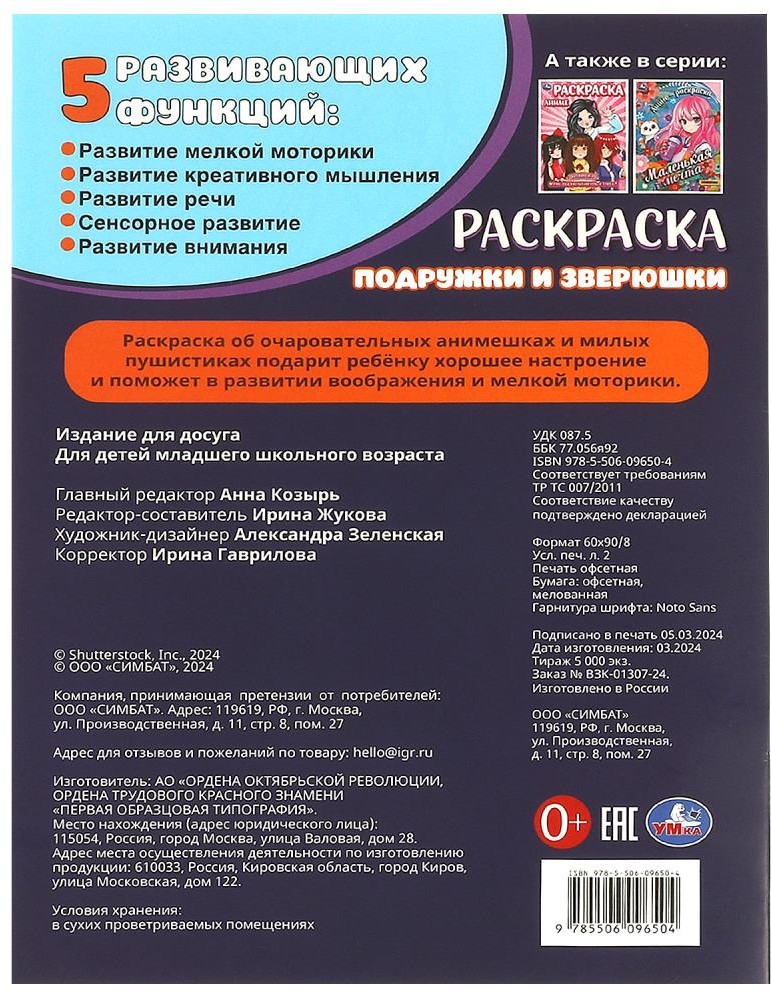 💳 Оплатить за товар можно при получении 🇰🇿 Есть бесплатная доставка по Казахстану 🎁 Копите бонусы с каждой покупки Раскраска «Подружки и зверюшки» — отличный подарок для юных художников: чёткий контур картинок для раскрашивания, короткие комментарии к рисункам на каждой странице, интересные и разнообразные иллюстрации, милые аниме-персонажи. Эта увлекательная раскраска с картинками в стиле аниме непременно понравится вашему ребёнку. В ней он найдёт интересные картинки с чёткими контурами и сюжетными текстами к ним. Благодаря удобному формату раскраску можно взять с собой в дорогу. Игровые занятия с раскраской ТМ «УМка» способствуют развитию: моторики, внимания, творческого мышления, усидчивости, визуального восприятия. |