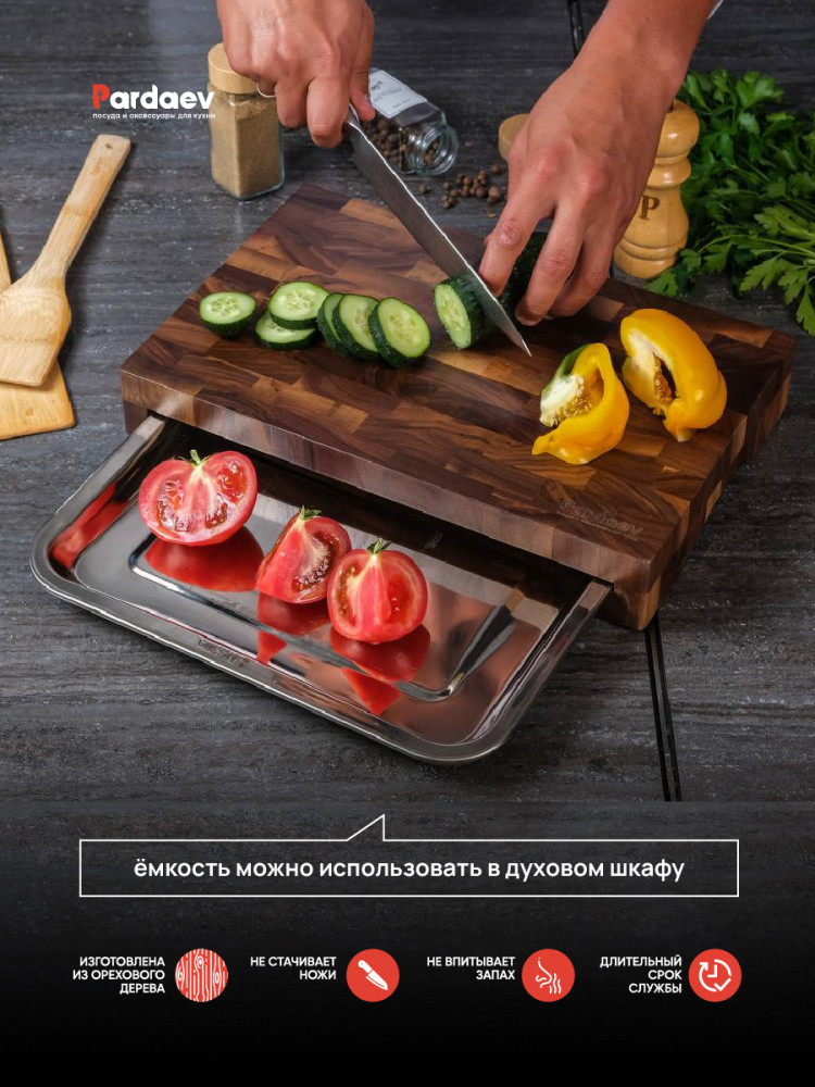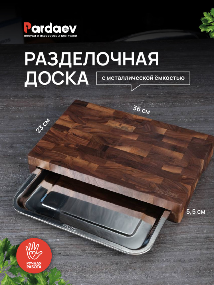 Pardaev Разделочная доскаВ данный момент этот товар отсутствует в продаже. Возможно, у нас найдется аналогичный или похожий товар здесь. Ореховое дерево является одним из самых популярных материалов для изготовления разделочных досок благодаря своей прочности, долговечности и красивому внешнему виду. |