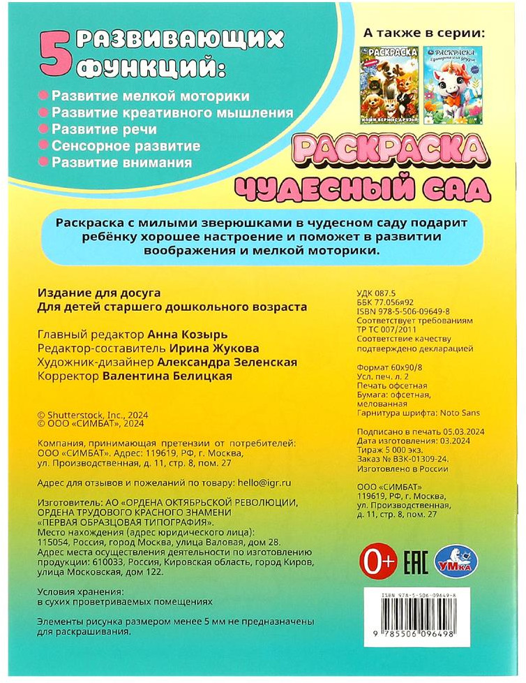 💳 Оплатить за товар можно при получении 🇰🇿 Есть бесплатная доставка по Казахстану от 1 дня 🎁 Копите бонусы с каждой покупки Раскраска «Чудесный сад» — отличный подарок для юных художников: чёткий контур картинок для раскрашивания, короткие комментарии к рисункам на каждой странице, интересные и разнообразные иллюстрации, милые персонажи. Эта увлекательная раскраска с очаровательными зверушками непременно понравится вашему ребёнку. В ней он найдёт интересные картинки с чёткими контурами и сюжетными текстами к ним. Благодаря удобному формату раскраску можно взять с собой в дорогу. Игровые занятия с раскраской ТМ «УМка» способствуют развитию: моторики, внимания, творческого мышления, усидчивости, визуального восприятия. |