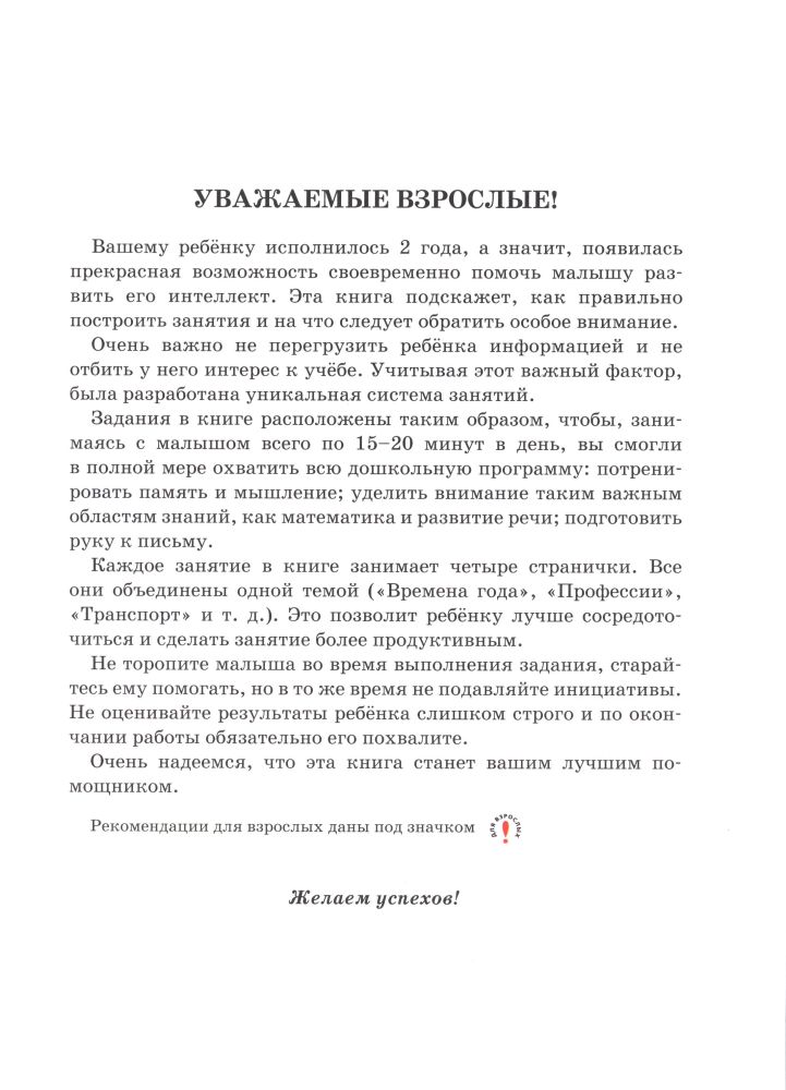Пособие - очень хорошее подспорье для родителей, которые хотят развивать своего ребенка, а не ждать чего-то от детского сада или водить в дорогостоящие заведения-развивашки. В некоторых городах просто нет таких достойных (в профессиональном плане) заведений. Задания ребенку интересны. Картинки крупные и яркие. Рисунки понятны. Подсказки для родителей на каждой страничке помогают и родителям правильно дать задание. Задания на различные тематики, как и заявлено. Бумага плотная. Переплет хоть и мягкий, но при аккуратном обращении держит хорошо. Рекомендую.