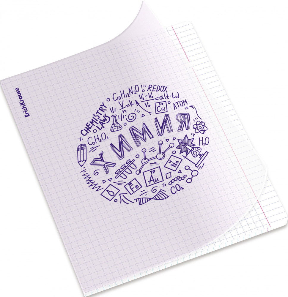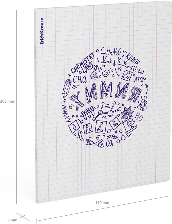 Серия: Chaos Тетрадь предметная формата А5+ (170 × 203 мм). Обложка выполнена из высококачественного износостойкого прозрачного пластика с фактурой «песок». В блоке 48 листов в клетку с полями. Бумага офсетная плотностью 60 г/м². Белизна бумаги — 100%. Цвет линовки — синий. Скругленные уголки обложки и блока. Тип скрепления — скоба.  |