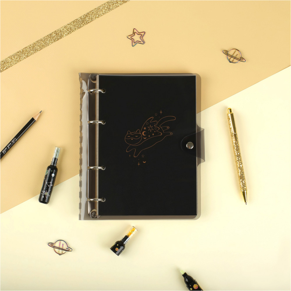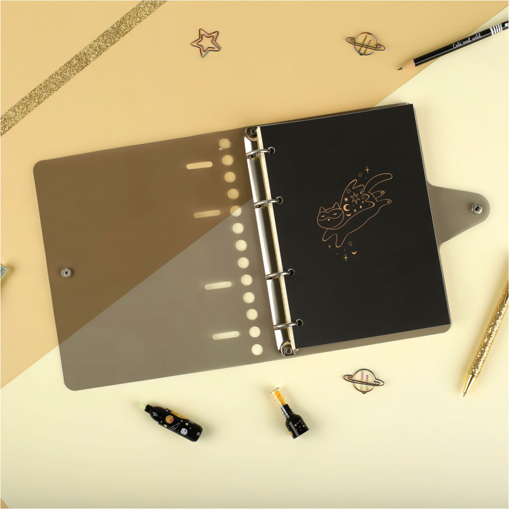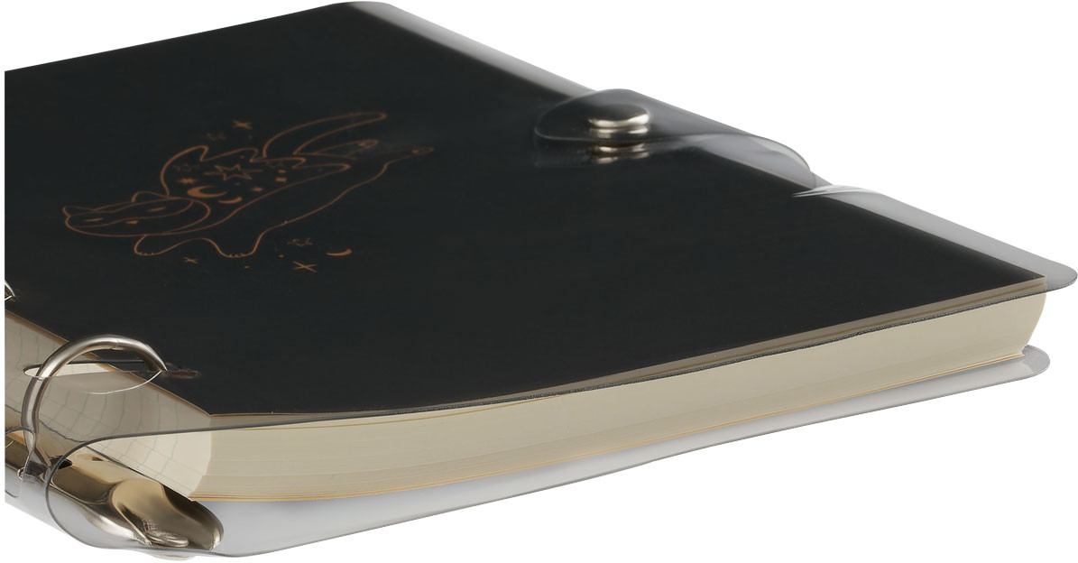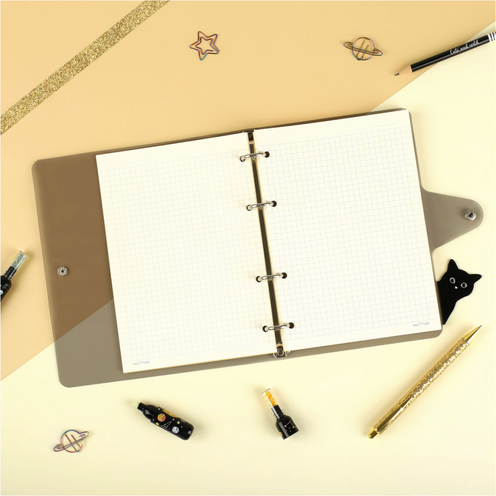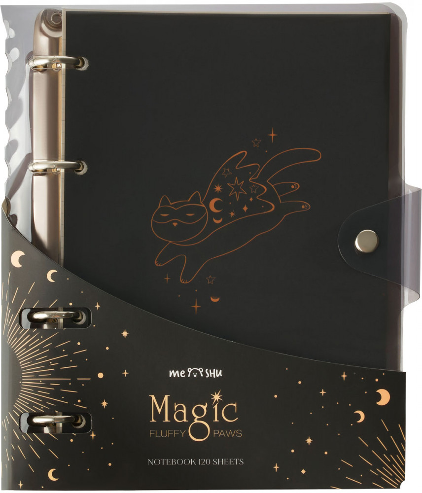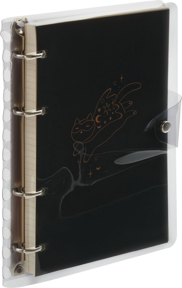 Meshu Тетрадь на кольцах «Black cat»В данный момент этот товар отсутствует в продаже. Возможно, у нас найдется аналогичный или похожий товар здесь. Тетрадь общая на кольцах «Meshu» серии «Black cat» формата А5 — незаменимый помощник для большого объёма записей на учёбе и работе. Внутренний блок — 120 листов кремовой офсетной бумаги плотностью 65 г/м², белизна — 100%, линовка — клетка. Тетрадь со скруглённым корешком имеет кольцевой механизм для быстрой смены или добавления листов, состоящий из 4 колец. Обложка изготовлена из мягкого пластика и имеет опоясывающую ленту с застёжкой-кнопкой. Тетрадь выполнена в стильном и оригинальном дизайне, который впечатлит ценителей нестандартных аксессуаров для записей. Упакована в индивидуальный пакет. |