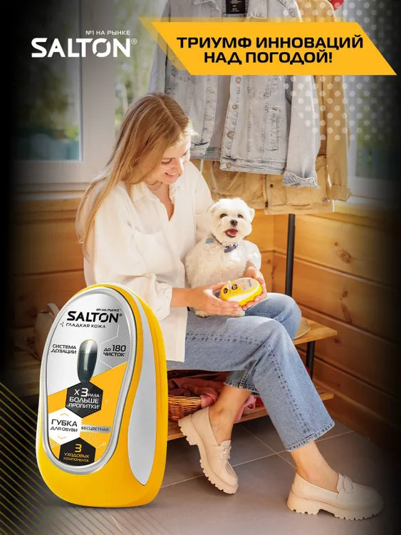 Благодаря инновационной технологии All-Day-Effect Губки с дозатором Salton поддерживают ухоженный вид обуви в течение всего дня: очищают от пыли, загрязнений и придают естественный блеск. |