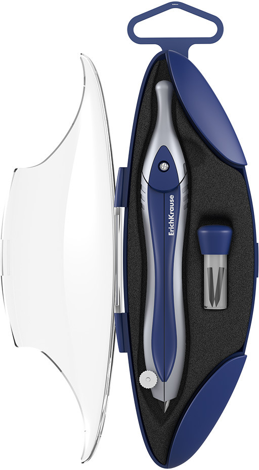 Металлический циркуль с максимальным радиусом 150 мм. В комплект входят сменные грифели в пластиковом контейнере. Упакован в удобный пластиковый футляр с европодвесом.