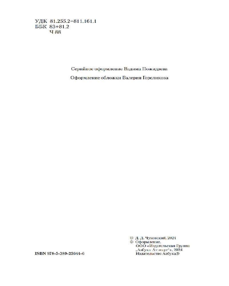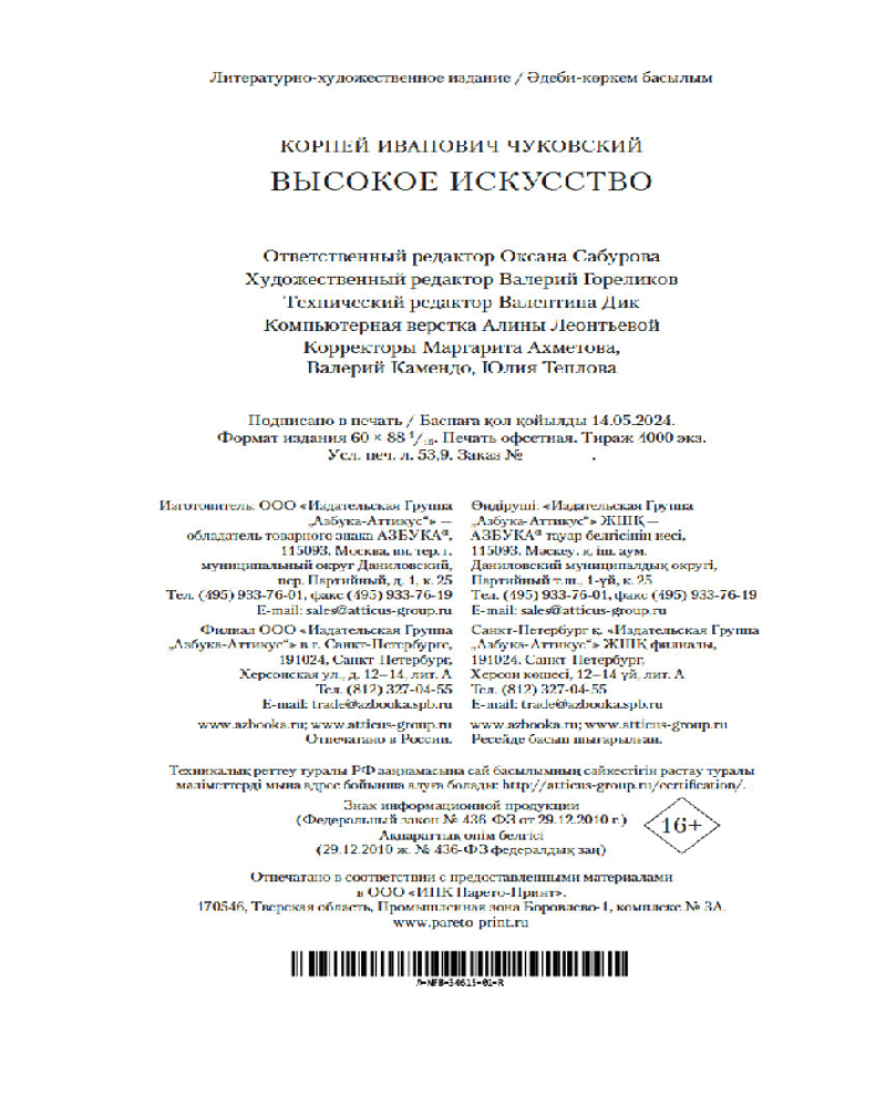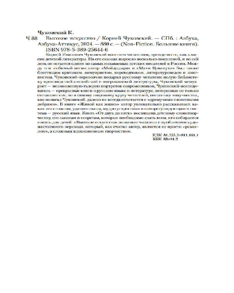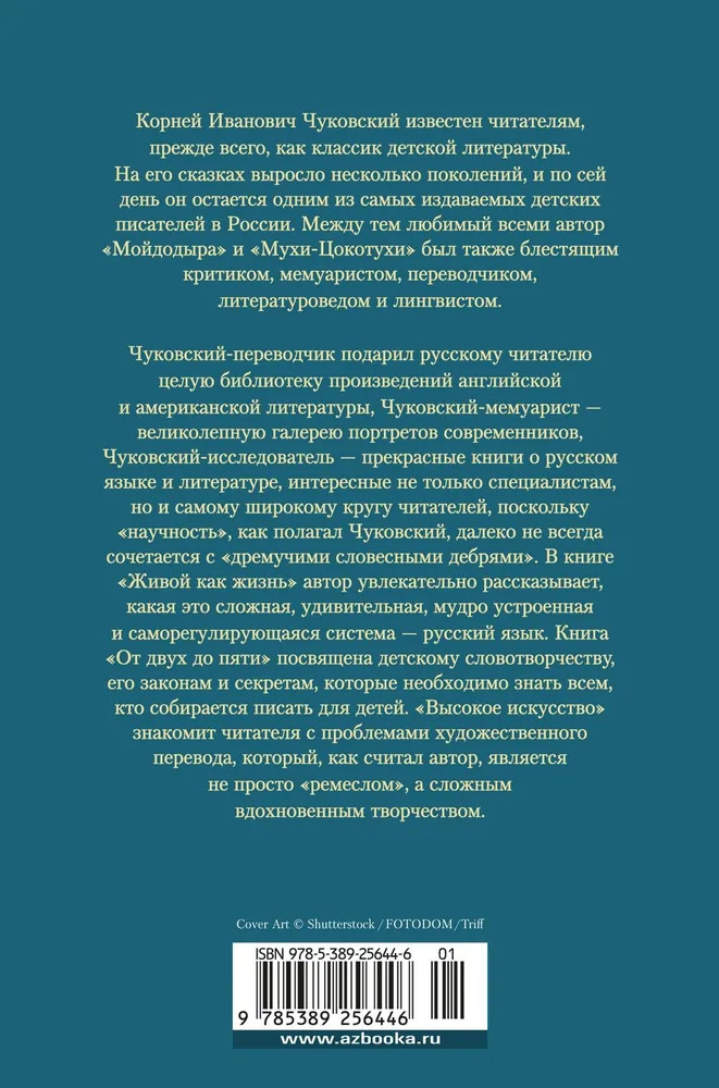 💳 Оплатить за товар можно при получении 🇰🇿 Есть бесплатная доставка по Казахстану от 1 дня 🎁 Копите бонусы с каждой покупки Серия: Non-Fiction. Большие книги Корней Иванович Чуковский известен читателям, прежде всего, как классик детской литературы. На его сказках выросло несколько поколений, и по сей день он остается одним из самых издаваемых детских писателей в России. Между тем любимый всеми автор «Мойдодыра» и «Мухи-Цокотухи» был также блестящим критиком, мемуаристом, переводчиком, литературоведом и лингвистом. Чуковский-переводчик подарил русскому читателю целую библиотеку произведений английской и американской литературы, Чуковский-мемуарист — великолепную галерею портретов современников, Чуковский-исследователь — прекрасные книги о русском языке и литературе, интересные не только специалистам, но и самому широкому кругу читателей, поскольку «научность», как полагал Чуковский, далеко не всегда сочетается с «дремучими словесными дебрями». В книге «Живой как жизнь» автор увлекательно рассказывает, какая это сложная, удивительная, мудро устроенная и саморегулирующаяся система — русский язык. Книга «От двух до пяти» посвящена детскому словотворчеству, его законам и секретам, которые необходимо знать всем, кто собирается писать для детей. «Высокое искусство» знакомит читателя с проблемами художественного перевода, который, как считал автор, является не просто «ремеслом», а сложным вдохновенным творчеством. |