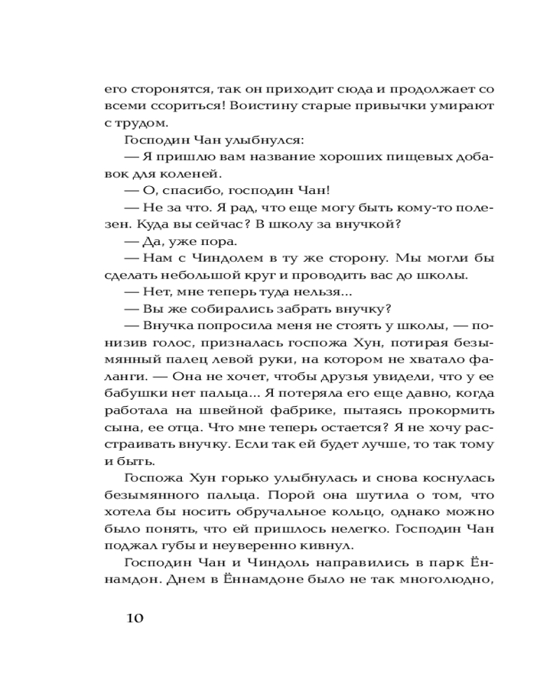 В целом посыл книги хороший, местами повествование даже затрагивает душу. Но возможно из-за не совсем удачного, на мой взгляд, перевода - читается тяжеловато. Перевод по большей части прямой, не совсем адаптированный. Обилие корейских имён - язык сломаешь. Сюжет наивный, местами неправдоподобный. Но может так и задумано было, чтобы мозг совсем отключился и отдыхал)) Еле дочитала, и то только из-за извечной навязчивой привычки обязательно дочитывать начатую книгу. В конце повествования (спойлер!) предложение одного из героев постирать все вещи вместе в одной машинке, наверняка символизирующее объединение, общность, мир и согласие - вызвало острый приступ материально-бытовушного неприятия и брезгливости (вещи разных людей, с разными загрязнениями, пятнами - 100% полинялые вещи на выходе и букет поделенных на всех бактерий и каких-нибудь кожных заболеваний). Ну в общем мне книга не очень понравилась. Но для подростков с их незамутненным, идеалистичным мировосприятием возможно будет в самый раз)