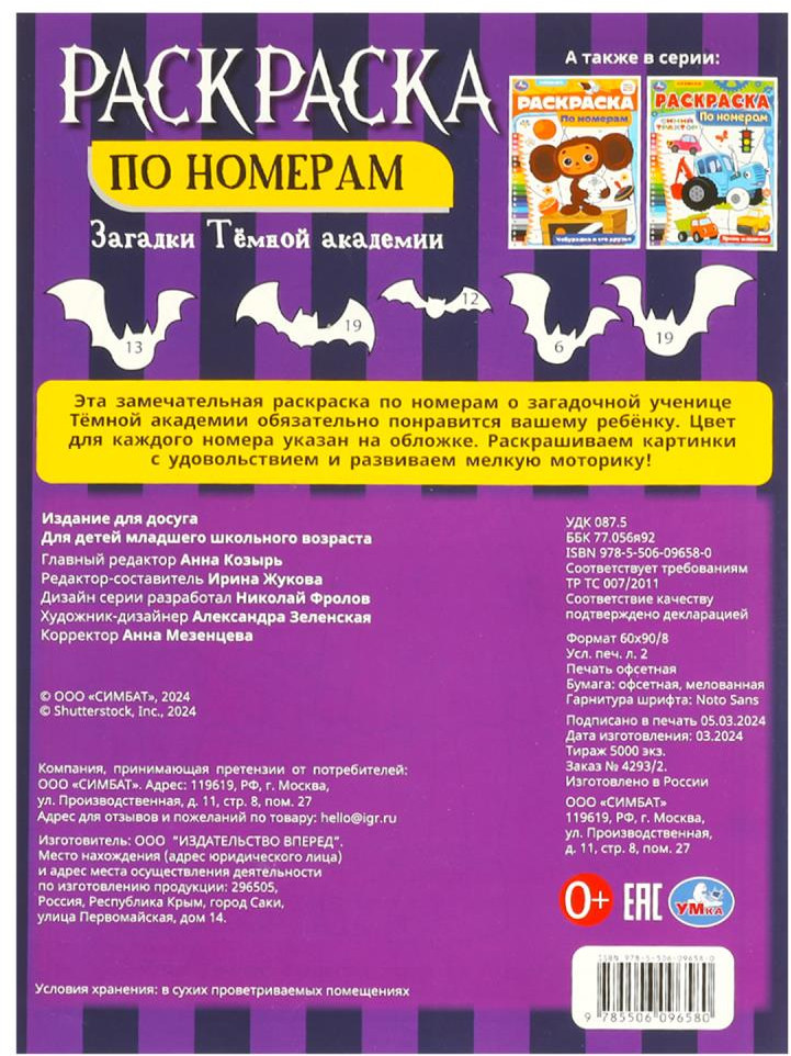 💳 Оплатить за товар можно при получении 🇰🇿 Есть бесплатная доставка по Казахстану от 1 дня 🎁 Копите бонусы с каждой покупки Раскраска по номерам «Загадки Тёмной академии» — отличный подарок для детей: картинки для раскрашивания тщательно прорисованы, короткие комментарии к каждой иллюстрации, у каждого цвета свой номер (подсказка на обложке). Юный художник будет рад встрече с героями популярного сериала на страницах этой занимательной раскраски. Используя цветовые подсказки, он правильно раскрасит части картинок и легко запомнит цифры. Раскраска поможет ребёнку не только увлекательно провести досуг, но и потренирует его руку к письму. Игровые занятия с раскраской ТМ «УМка» способствуют развитию: моторики, внимания, творческого мышления, усидчивости, визуального восприятия. |