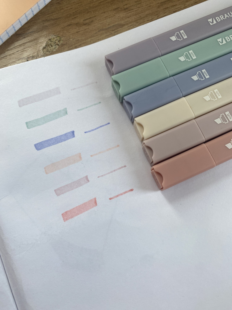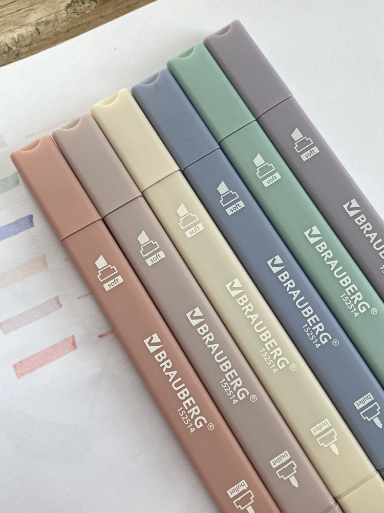 Красивые и нежные цвета. Все текстовыделители в рабочем состоянии, не сухие. Яркость оттенка варьируется в зависимости от бумаги, на которой "работает" маркер. Можно пройтись в 2-3 слоя, чтобы цвет был заметнее и насыщеннее. Покупкой довольна, спасибо 💜