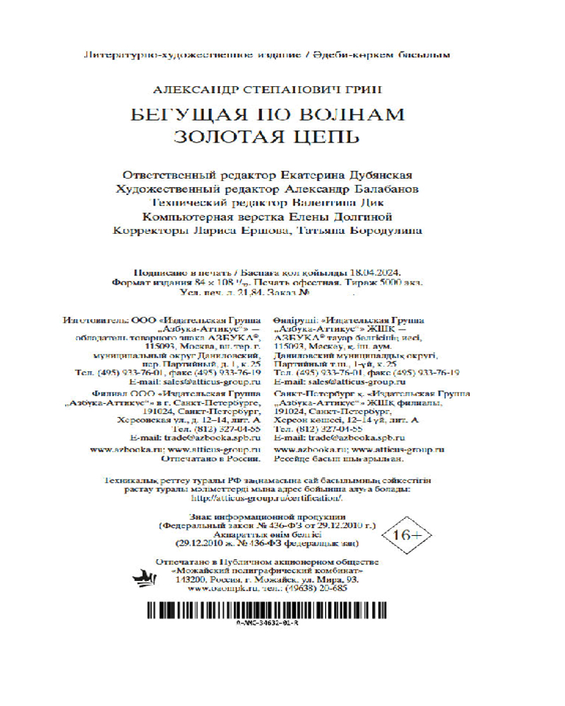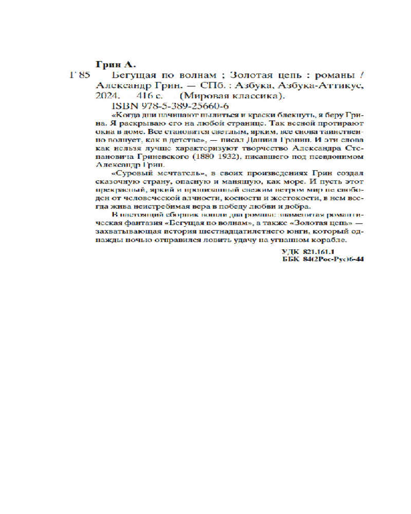 💳 Оплатить за товар можно при получении 🇰🇿 Есть бесплатная доставка по Казахстану 🎁 Копите бонусы с каждой покупки Серия: Мировая классика «Когда дни начинают пылиться и краски блекнуть, я беру Грина. Я раскрываю его на любой странице. Так весной протирают окна в доме. Все становится светлым, ярким, все снова таинственно волнует, как в детстве», — писал Даниил Гранин. И эти слова как нельзя лучше характеризуют творчество Александра Степановича Гриневского (1880-1932), писавшего под псевдонимом Александр Грин. «Суровый мечтатель», в своих произведениях Грин создал сказочную страну, опасную и манящую, как море. И пусть этот прекрасный, яркий и пронизанный свежим ветром мир не свободен от человеческой алчности, косности и жестокости, в нем всегда жива неистребимая вера в победу любви и добра. В настоящий сборник вошли два романа: знаменитая романтическая фантазия «Бегущая по волнам», а также «Золотая цепь» — захватывающая история шестнадцатилетнего юнги, который однажды ночью отправился ловить удачу на угнанном корабле. |