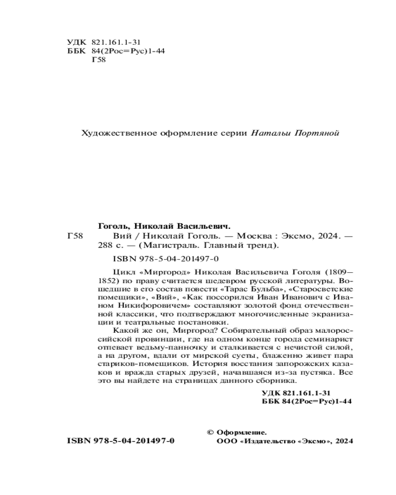 💳 Оплатить за товар можно при получении 🇰🇿 Есть бесплатная доставка по Казахстану от 1 дня 🎁 Копите бонусы с каждой покупки Серия: Магистраль. Главный тренд Цикл «Миргород» Николая Васильевича Гоголя (1809–1852) по праву считается шедевром русской литературы. Вошедшие в его состав повести «Тарас Бульба», «Старосветские помещики», «Вий», «Как поссорился Иван Иванович с Иваном Никифоровичем» составляют «золотой фонд» отечественной классики, что подтверждают многочисленные экранизации и театральные постановки. Какой же он, Миргород? Собирательный образ малороссийской провинции, где на одном конце города семинарист отпевает ведьму-панночку и сталкивается с нечистой силой, а на другом, вдали от мирской суеты, блаженно живет пара стариков-помещиков. История восстания запорожских казаков и вражда старых друзей, начавшаяся из-за пустяка. Все это вы найдете на страницах данного сборника. |