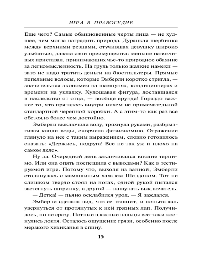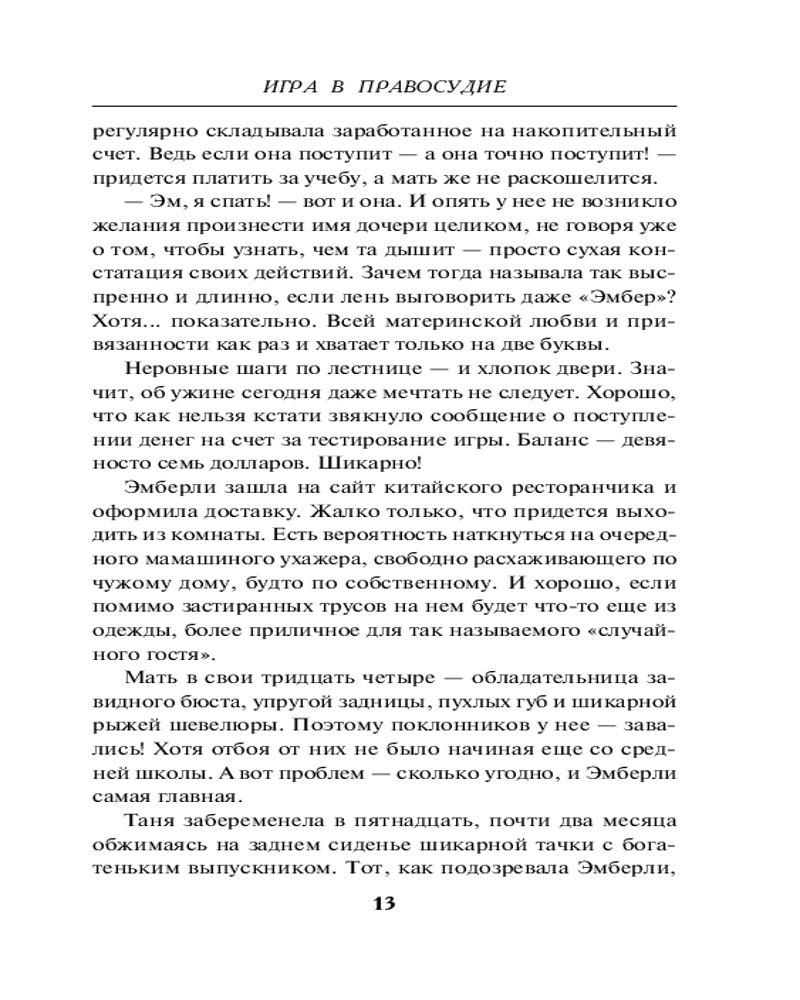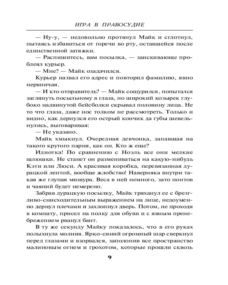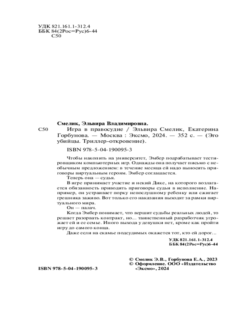 💳 Оплатить за товар можно при получении 🇰🇿 Есть бесплатная доставка по Казахстану от 1 дня 🎁 Копите бонусы с каждой покупки Серия: Эго убийцы. Триллер-откровение Чтобы накопить на университет, Эмбер подрабатывает тестировщиком компьютерных игр. Однажды она получает письмо с необычным предложением: в течение месяца ей надо выносить приговоры виртуальным героям. Эмбер соглашается. Теперь она — судья. В игре принимает участие и некий Дике, на которого возлагается обязанность приводить приговоры судьи в исполнение. Например, он устраивает порку непослушному ребенку или сжигает грешника заживо. Вот только его наказания выходят за рамки виртуального мира. Он — палач. Когда Эмбер понимает, что вершит судьбы реальных людей, то решает разорвать контракт, но... таинственный разработчик угрожает ей и ее семье. Иного выхода у девушки нет, кроме как пройти игру до самого конца. Даже если на скамье подсудимых окажется тот, кто ей дорог... |