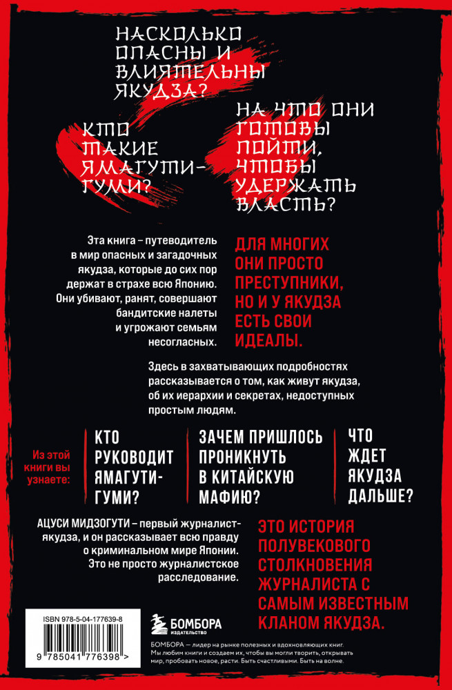 💳 Оплатить за товар можно при получении 🇰🇿 Есть бесплатная доставка по Казахстану 🎁 Копите бонусы с каждой покупки Серия: По ту сторону закона. Люди, кланы, группировки Это не просто журналистское расследование. Это история полувекового столкновения журналиста с самым известным кланом якудза. Эта книга — путеводитель в мир опасных и загадочных якудза, которые до сих пор держат в страхе всю Японию. Они убивают, ранят, совершают бандитские налеты и угрожают семьям несогласных. Для многих они просто преступники, но и у якудза есть свои идеалы. Здесь в захватывающих подробностях рассказывается о том, как живут якудза, об их иерархии и секретах, недоступных простым людям. |