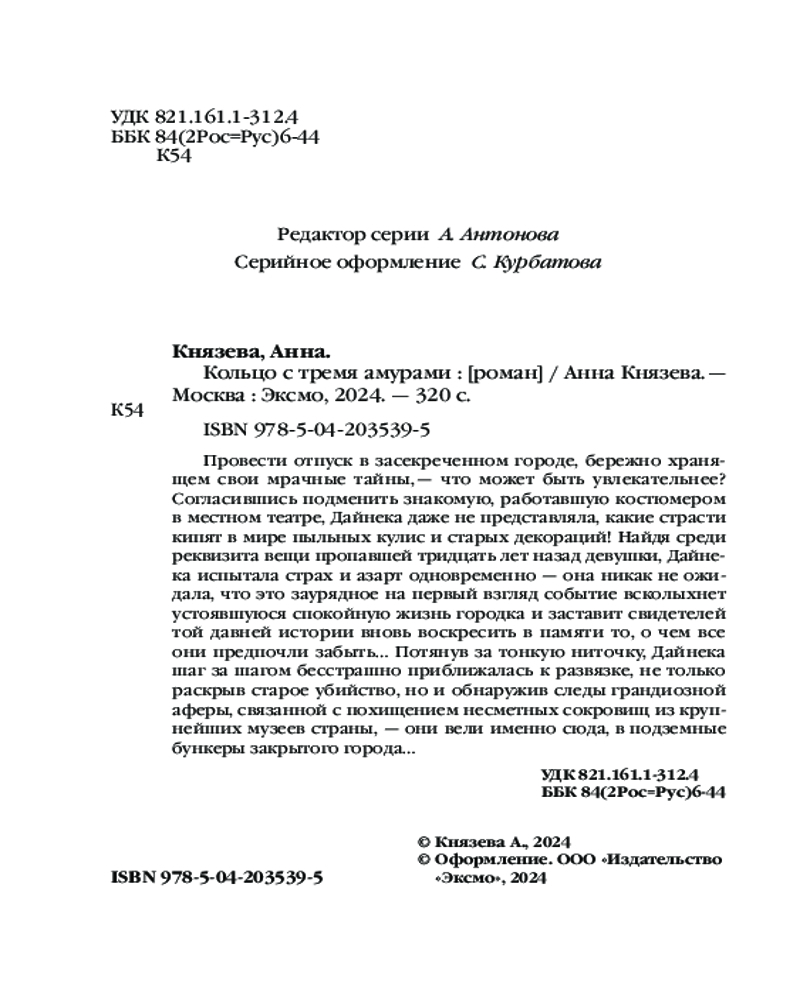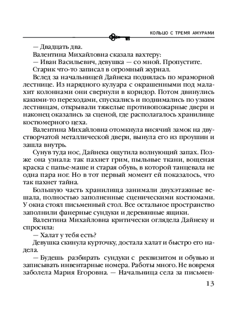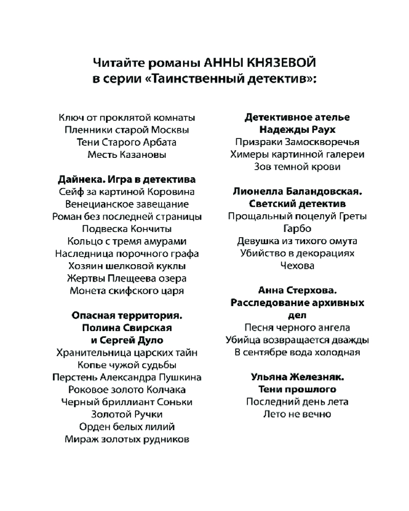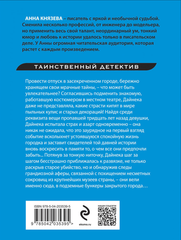 Кольцо с тремя амурамиВ данный момент этот товар отсутствует в продаже. Возможно, у нас найдется аналогичный или похожий товар здесь. Серия: Таинственный детектив Анны Князевой. Новое оформление (обложка) Провести отпуск в засекреченном городе, бережно хранящем свои мрачные тайны, — что может быть увлекательнее? Согласившись подменить знакомую, работавшую костюмером в местном театре, Дайнека даже не представляла, какие страсти кипят в мире пыльных кулис и старых декораций! Найдя среди реквизита вещи пропавшей тридцать лет назад девушки, Дайнека испытала страх и азарт одновременно — она никак не ожидала, что это заурядное на первый взгляд событие всколыхнет устоявшуюся спокойную жизнь городка и заставит свидетелей той давней истории вновь воскресить в памяти то, о чем все они предпочли забыть... Потянув за тонкую ниточку, Дайнека шаг за шагом бесстрашно приближалась к развязке, не только раскрыв старое убийство, но и обнаружив следы грандиозной аферы, связанной с похищением несметных сокровищ из крупнейших музеев страны — они вели именно сюда, в подземные бункеры закрытого города... |