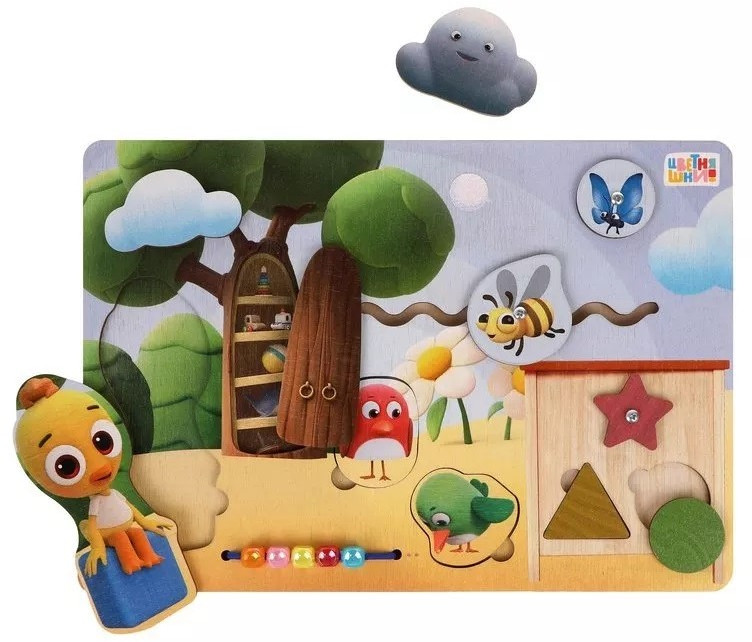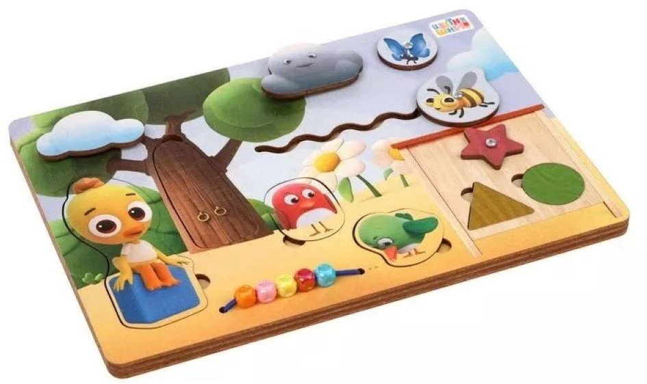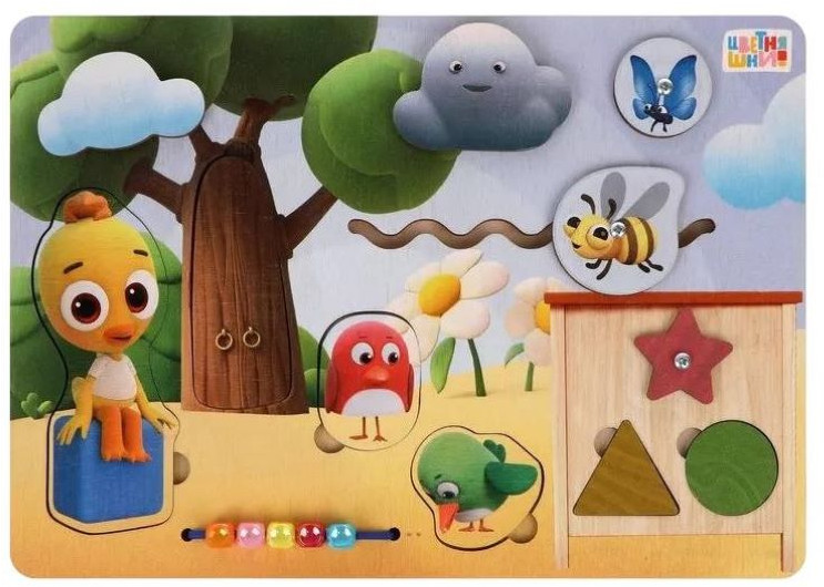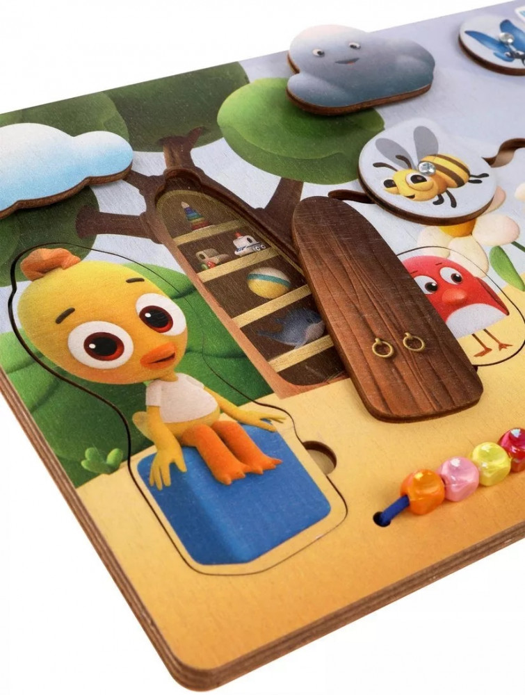 Детская игрушка-бизиборд «Цыпленок Пи» очень популярна у детей и их родителей. Еще бы, ведь она сочетает в себе сразу несколько развлечений, которые, к тому же полезны для развития мелкой моторики ребенка. Около вкладышей имеется выемка для пальчиков, благодаря чему их удобно доставать из основы.