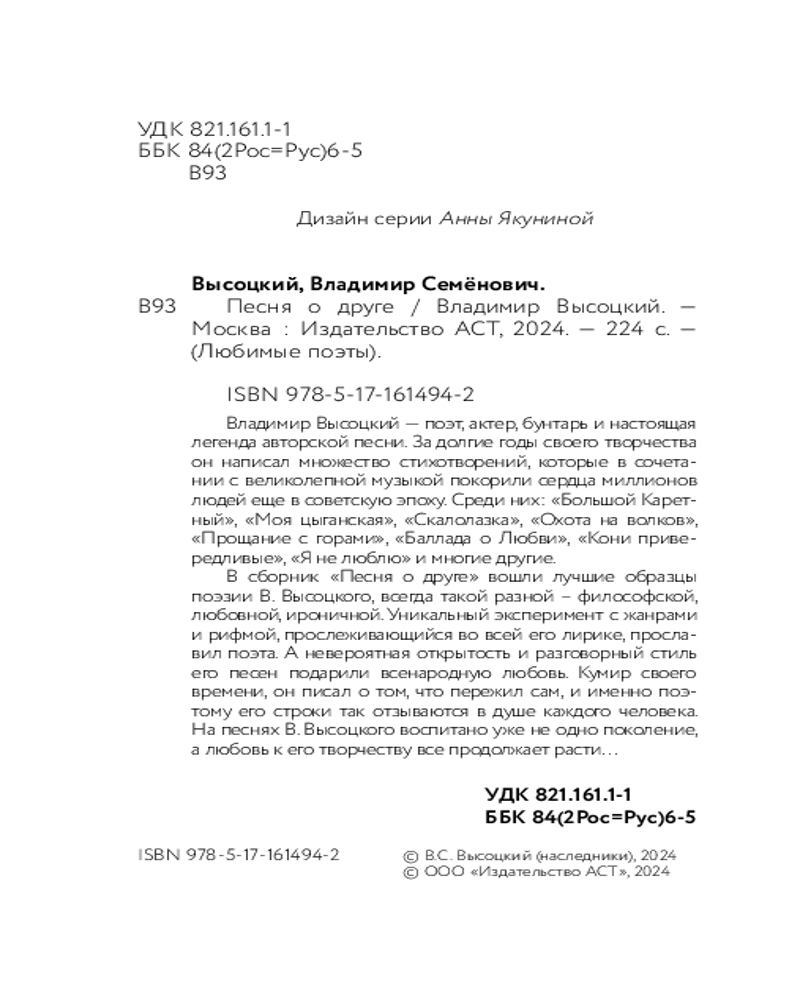 💳 Оплатить за товар можно при получении 🇰🇿 Есть бесплатная доставка по Казахстану от 1 дня 🎁 Копите бонусы с каждой покупки Серия: Любимые поэты Владимир Высоцкий — поэт, актер, бунтарь и настоящая легенда авторской песни. За долгие годы своего творчества он написал множество стихотворений, которые в сочетании с великолепной музыкой покорили сердца миллионов людей еще в советскую эпоху. Среди них: «Большой Каретный», «Моя цыганская», «Скалолазка», «Охота на волков», «Прощание с горами», «Баллада о Любви», «Кони привередливые», «Я не люблю» и многие другие. |
