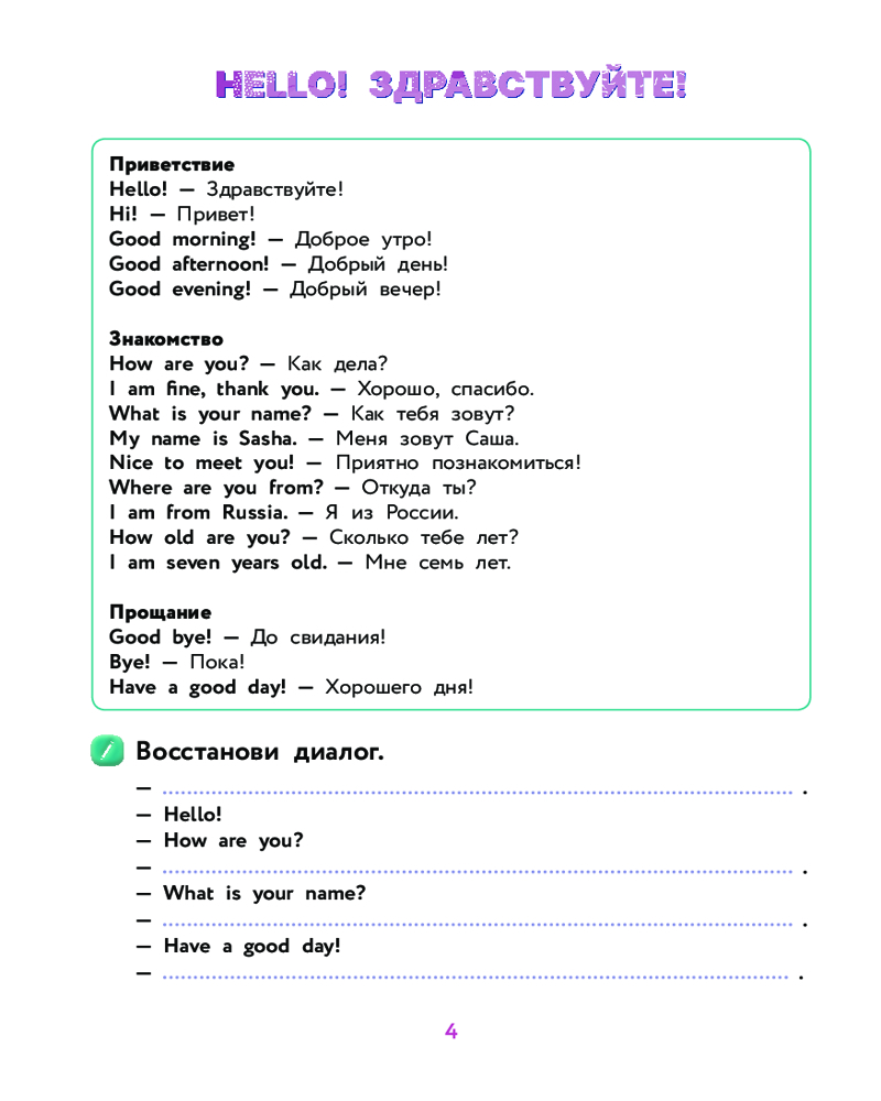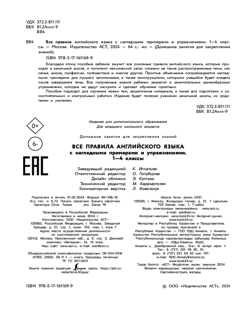 💳 Оплатить за товар можно при получении 🇰🇿 Есть бесплатная доставка по Казахстану от 1 дня 🎁 Копите бонусы с каждой покупки Серия: Домашние занятия для закрепления знаний Благодаря этому пособию ребенок выучит все основные правила английского языка, которые проходят в начальной школе, и пополнит словарный запас словами на такие распространенные темы, как семья, школа, профессии, путешествия и многие другие. Простые объяснения сопровождаются наглядными примерами для лучшего запоминания, а также конструкциями, которыми учащийся будет владеть после завершения темы. Все полученные знания ребенок закрепит в занимательных разнообразных упражнениях, которые не дадут заскучать и сделают обучение приятным. |