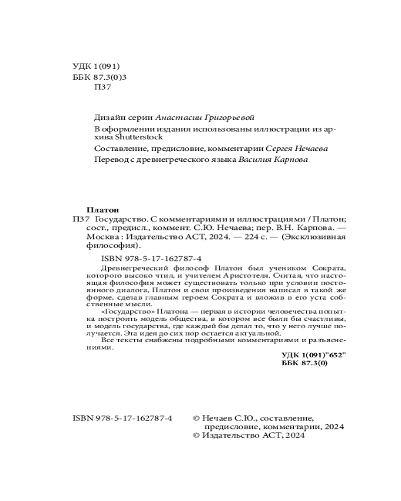 💳 Оплатить за товар можно при получении 🇰🇿 Есть бесплатная доставка по Казахстану 🎁 Копите бонусы с каждой покупки Серия: Эксклюзивная философия Древнегреческий философ Платон был учеником Сократа, которого высоко чтил, и учителем Аристотеля. Считая, что настоящая философия может существовать только при условии постоянного диалога, Платон и свои произведения написал в такой же форме, сделав главным героем Сократа и вложив в его уста собственные мысли. «Государство» Платона — первая в истории человечества попытка построить модель общества, в котором все были бы счастливы, и модель государства, где каждый бы делал то, что у него лучше получается. Эта идея до сих пор остается актуальной. Все тексты снабжены подробными комментариями и разъяснениями. |