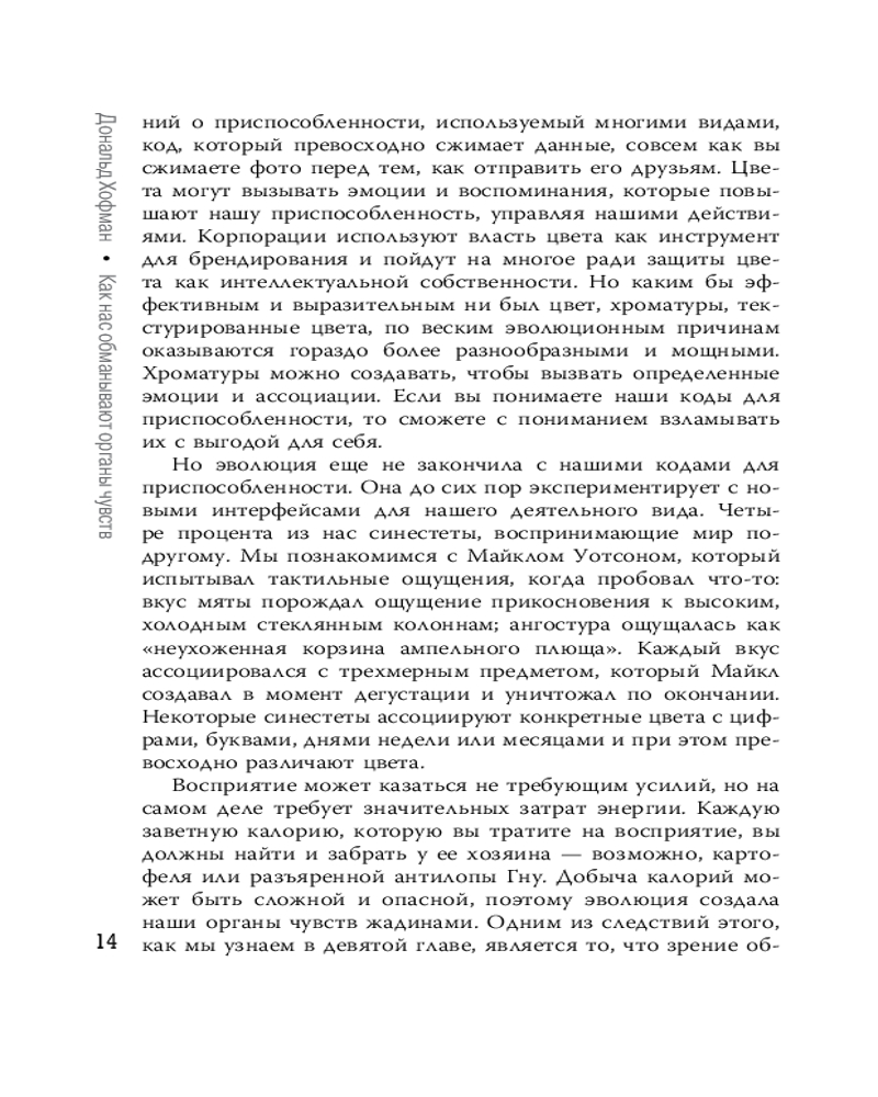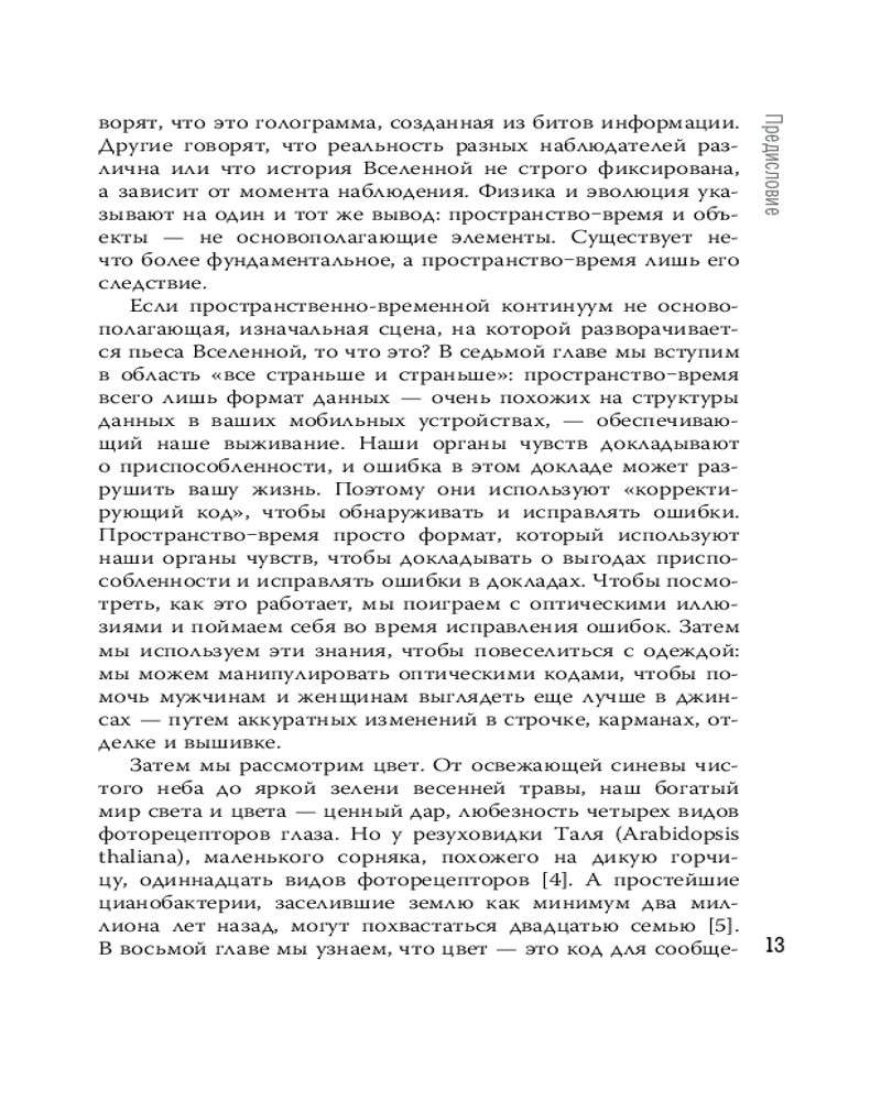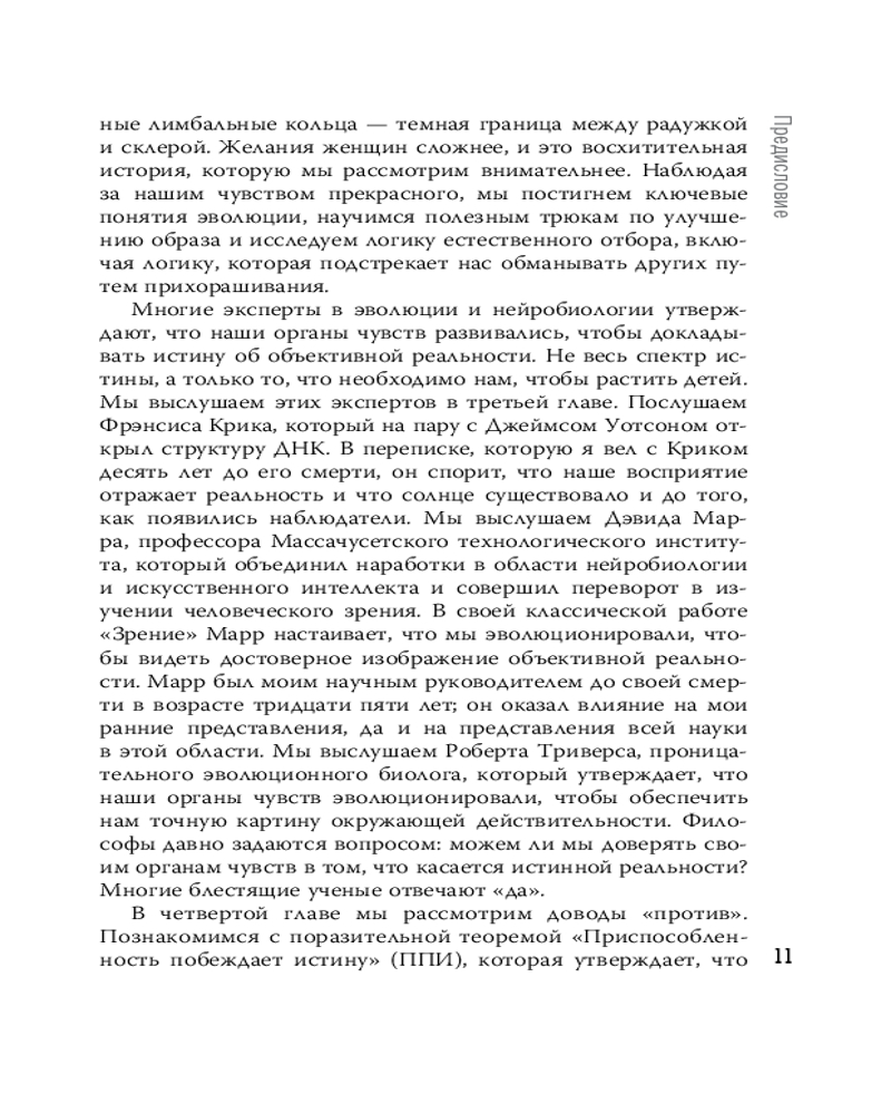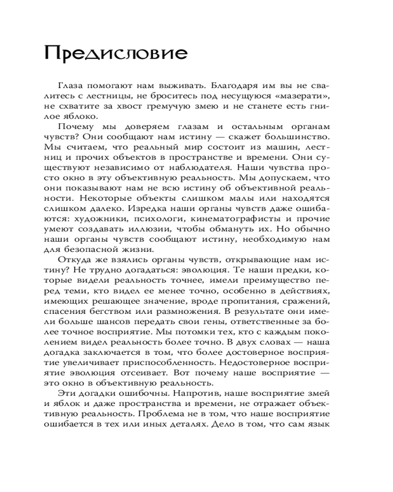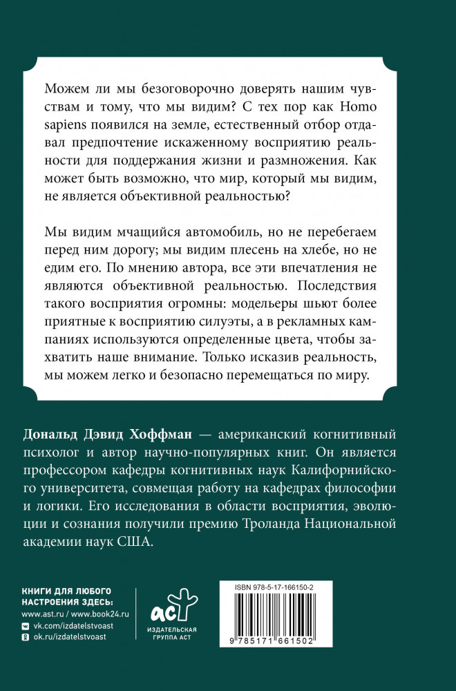 💳 Оплатить за товар можно при получении 🇰🇿 Есть бесплатная доставка по Казахстану от 1 дня 🎁 Копите бонусы с каждой покупки Серия: Интересный научпоп Можем ли мы безоговорочно доверять нашим чувствам и тому, что мы видим? С тех пор как Homo sapiens появился на земле, естественный отбор отдавал предпочтение искаженному восприятию реальности для поддержания жизни и размножения. Как может быть возможно, что мир, который мы видим, не является объективной реальностью? Мы видим мчащийся автомобиль, но не перебегаем перед ним дорогу; мы видим плесень на хлебе, но не едим его. По мнению автора, все эти впечатления не являются объективной реальностью. Последствия такого восприятия огромны: модельеры шьют более приятные к восприятию силуэты, а в рекламных кампаниях используются определенные цвета, чтобы захватить наше внимание. Только исказив реальность, мы можем легко и безопасно перемещаться по миру. |