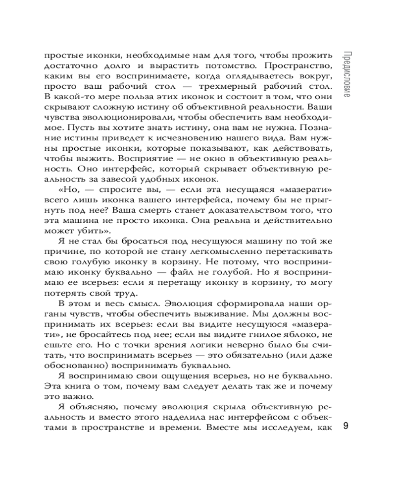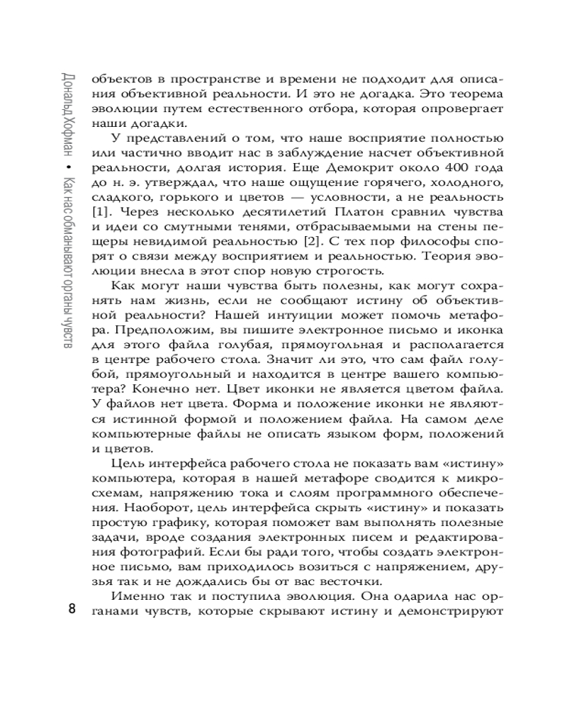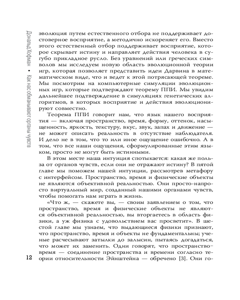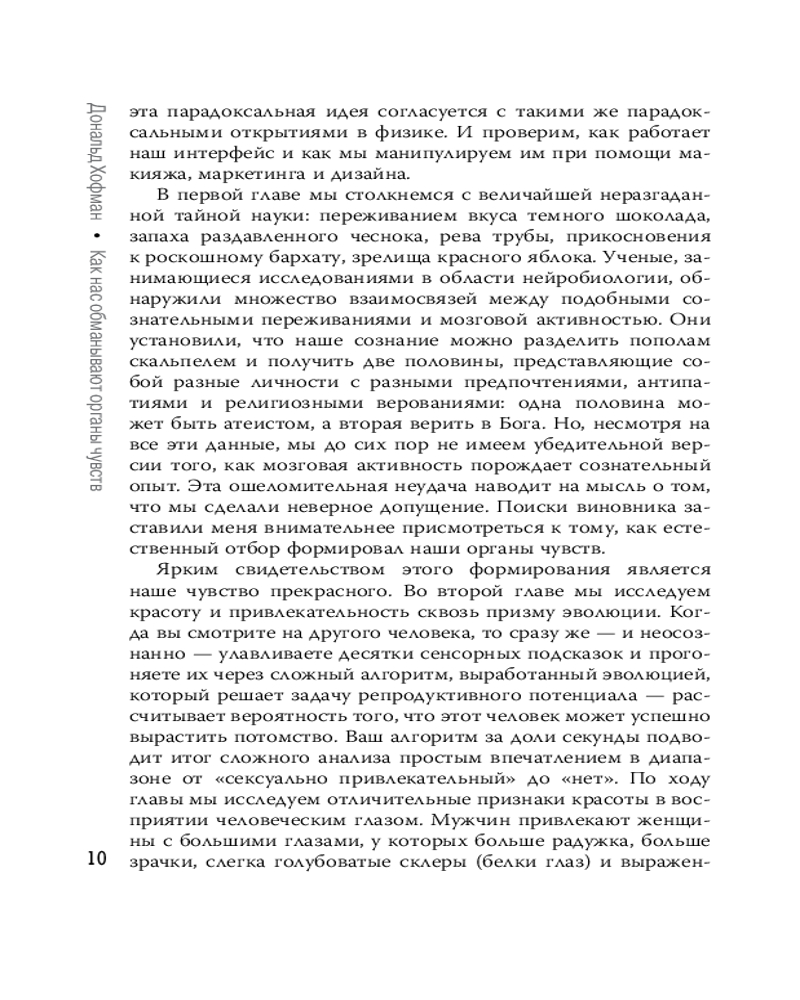 💳 Оплатить за товар можно при получении 🇰🇿 Есть бесплатная доставка по Казахстану от 1 дня 🎁 Копите бонусы с каждой покупки Серия: Интересный научпоп Можем ли мы безоговорочно доверять нашим чувствам и тому, что мы видим? С тех пор как Homo sapiens появился на земле, естественный отбор отдавал предпочтение искаженному восприятию реальности для поддержания жизни и размножения. Как может быть возможно, что мир, который мы видим, не является объективной реальностью? Мы видим мчащийся автомобиль, но не перебегаем перед ним дорогу; мы видим плесень на хлебе, но не едим его. По мнению автора, все эти впечатления не являются объективной реальностью. Последствия такого восприятия огромны: модельеры шьют более приятные к восприятию силуэты, а в рекламных кампаниях используются определенные цвета, чтобы захватить наше внимание. Только исказив реальность, мы можем легко и безопасно перемещаться по миру. |