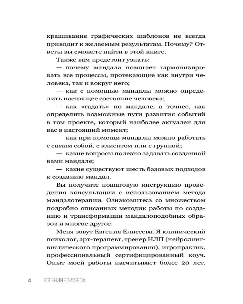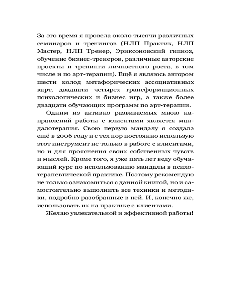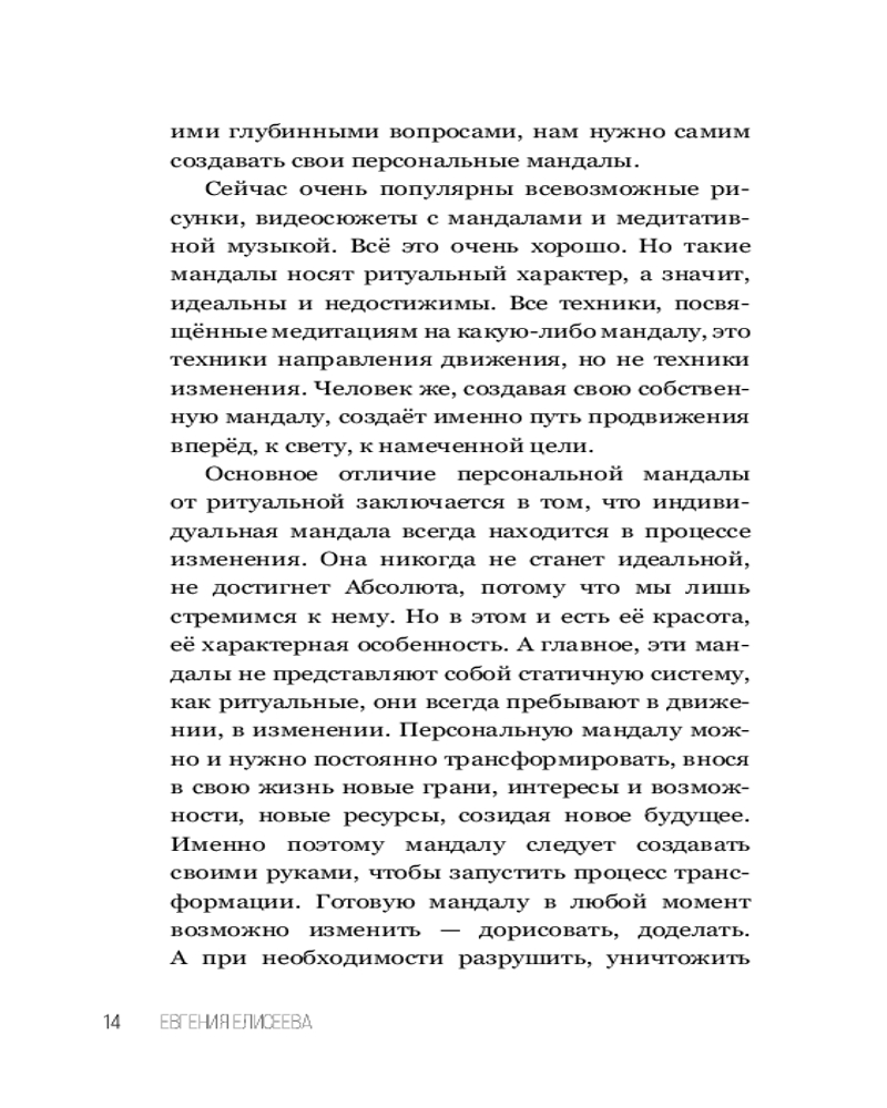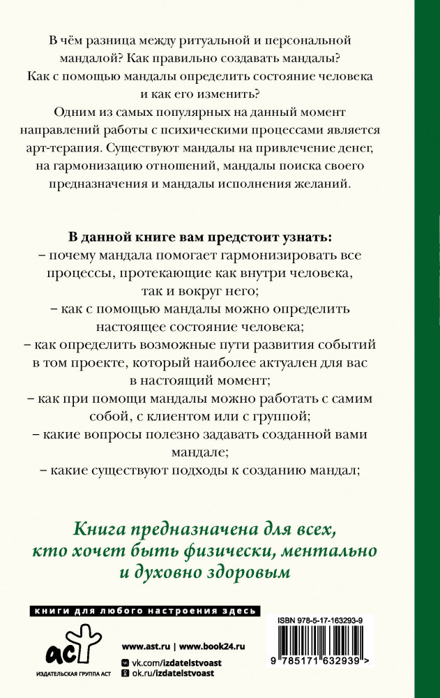 💳 Оплатить за товар можно при получении 🇰🇿 Есть бесплатная доставка по Казахстану от 1 дня 🎁 Копите бонусы с каждой покупки Серия: Практики счастья и успеха В чём разница между ритуальной и персональной мандалой? Как правильно создавать мандалы? Как с помощью мандалы определить состояние человека и как его изменить? Одним из самых популярных на данный момент направлений с психическими процессами является арт-терапия. Существуют мандалы на привлечение денег, на гармонизацию отношений, мандалы поиска своего предназначения и мандалы исполнения желаний. |