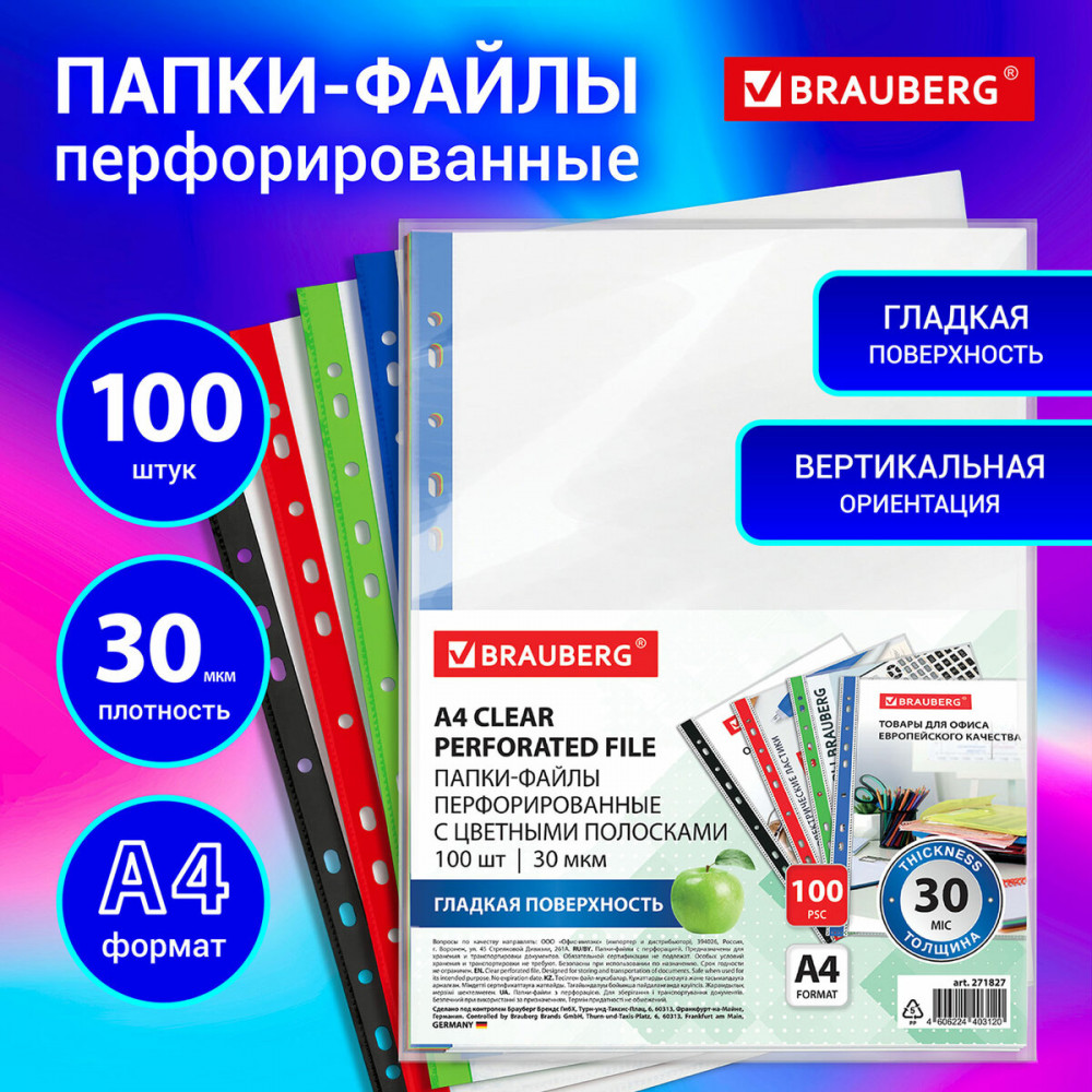 💳 Оплатить за товар можно при получении 🇰🇿 Есть бесплатная доставка по Казахстану 🎁 Копите бонусы с каждой покупки Перфорированные папки-файлы Brauberg с цветными полосками предназначены для хранения документов в папке с любым кольцевым механизмом или скоросшивателем. Перфопапки формата А4 с вертикальным размещением содержат универсальную перфорацию, а также имеют цветные полоски на корешке, что позволяет систематизировать документы по цветам. Файлы являются незаменимым атрибутом в офисе, позволяют систематизировать документы и обеспечивают их сохранность на долгое время. |