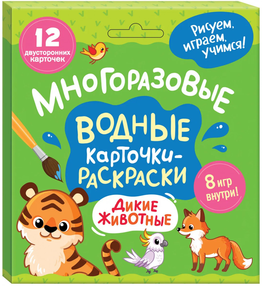 Серия: Многоразовые водные карточки-раскраски Для игры не нужны ни карандаши, ни краски — специальное покрытие меняет цвет при взаимодействии с водой, а после высыхания картинку можно раскрашивать снова! На лицевой стороне отгадывайте загадки и раскрашивайте картинки. На оборотной стороне выполняйте весёлые задания и изучайте диких животных. Правильно сортировать животных помогут пиктограммы. В наборе 12 двусторонних карточек, которые помогут ребёнку развить мелкую моторику, логику, внимание и речь. |