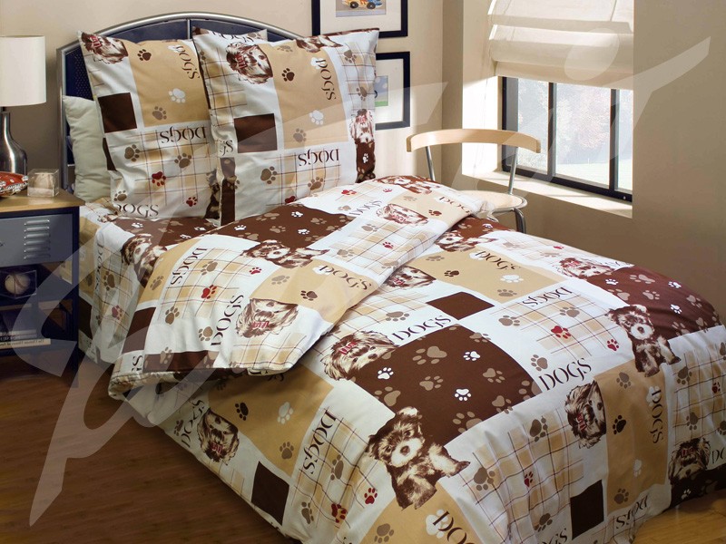 Цвета в оригинале более скучные, теплого коричневого оттенка нет в помине, комплект скорее холодно-розоватый. Наволочка в клетку, а не с собачками. При этом сама ткань прочная, стирается нормально. Но визуально выглядит хуже, чем на картинке.