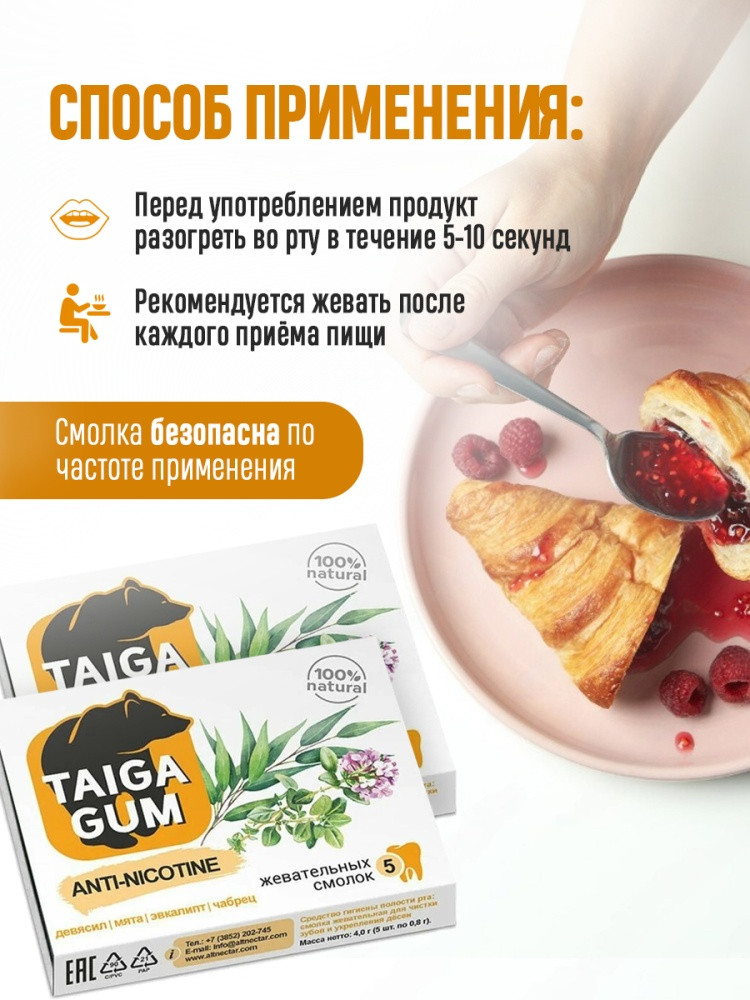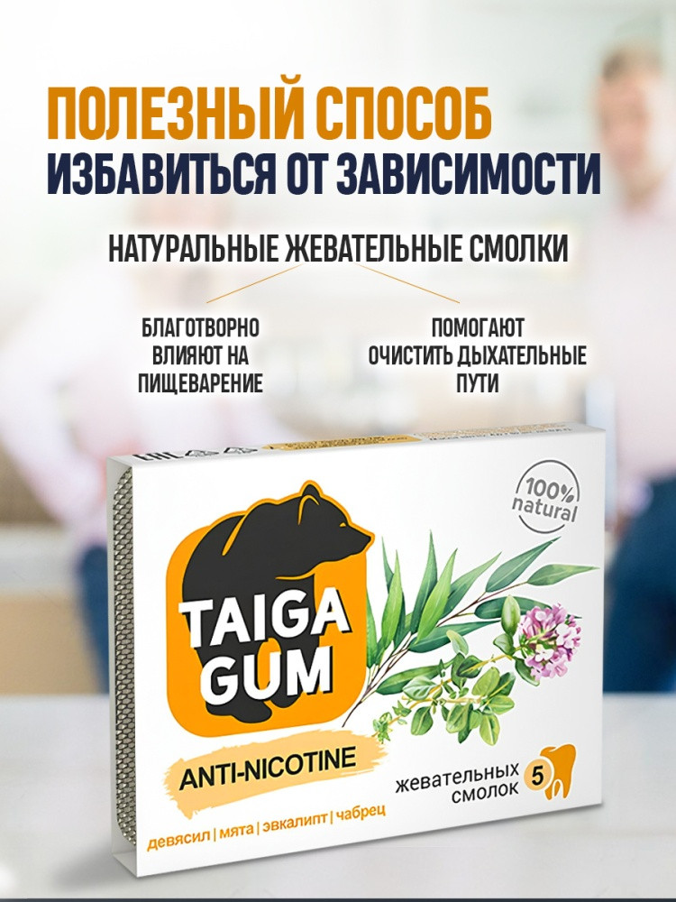 💳 Оплатить за товар можно при получении 🇰🇿 Есть бесплатная доставка по Казахстану 🎁 Копите бонусы с каждой покупки Серия: Taiga Gum Taiga Gum «Anti-Nicotine» — это 100% натуральная жевательная резинка. В отличие от большинства средств для отказа от курения, Taiga Gum не содержит медицинский никотин. Все положительные эффекты от её применения достигаются исключительно за счёт полезных природных компонентов: лиственничной смолы (живицы) и растительных экстрактов — девясила, мяты, эвкалипта, чабреца и аира. Воздействуя на вкусовые рецепторы, жвачка помогает ослабить психологическую зависимость от сигарет. |