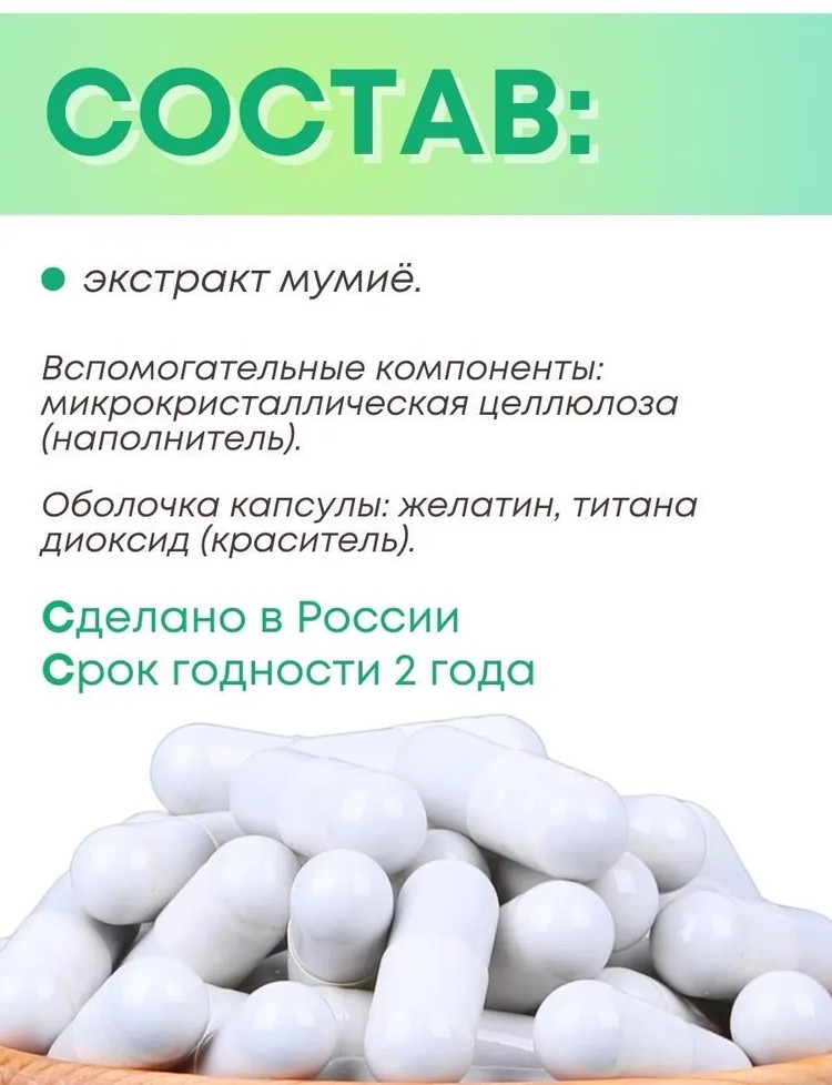 Гуминовые кислоты, входящие в состав мумие, улучшают питание мышечной ткани, повышая выносливость организма, что особенно важно при активном образе жизни, обладают способностью защищать клетки печени и почек от повреждений, что актуально при приеме антибиотиков. Способствуют нейтрализации патогенных бактерий и болезнетворных организмов. Активно используют в различных медицинских областях: устранении воспалений, вызванных бактериями, при проблемах с метаболизмом, токсичных отравлениях. Способствует ускоренной регенерации костной ткани при ее повреждениях, что подтверждено клиническими испытаниями.