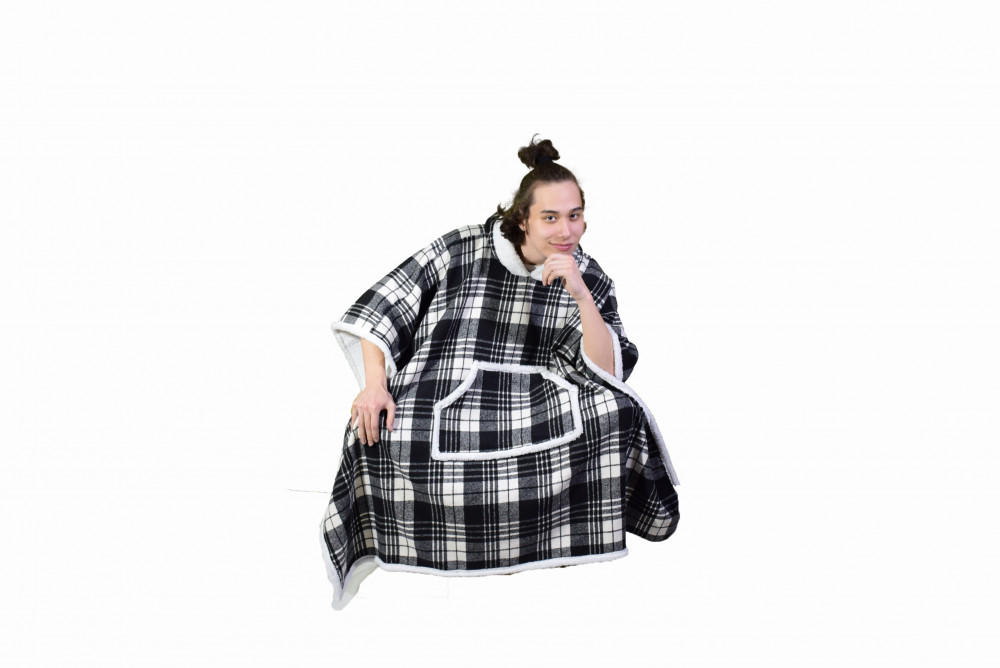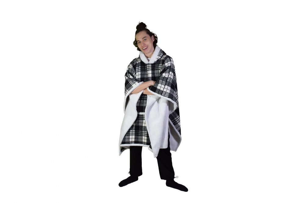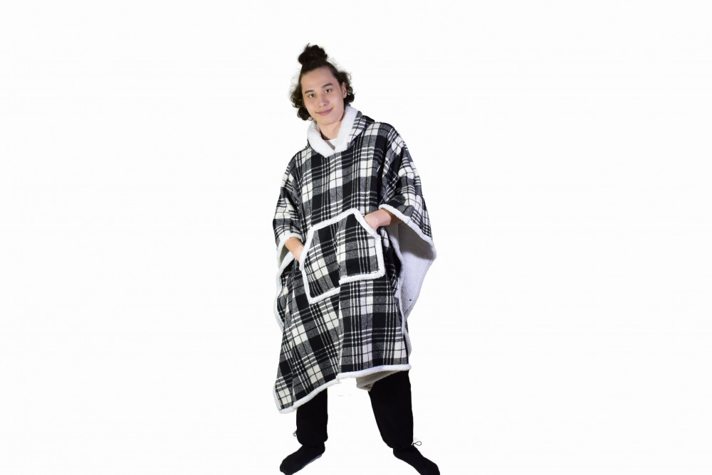 Пончо-плед может использоваться как накидка с капюшоном для прогулок на свежем воздухе.