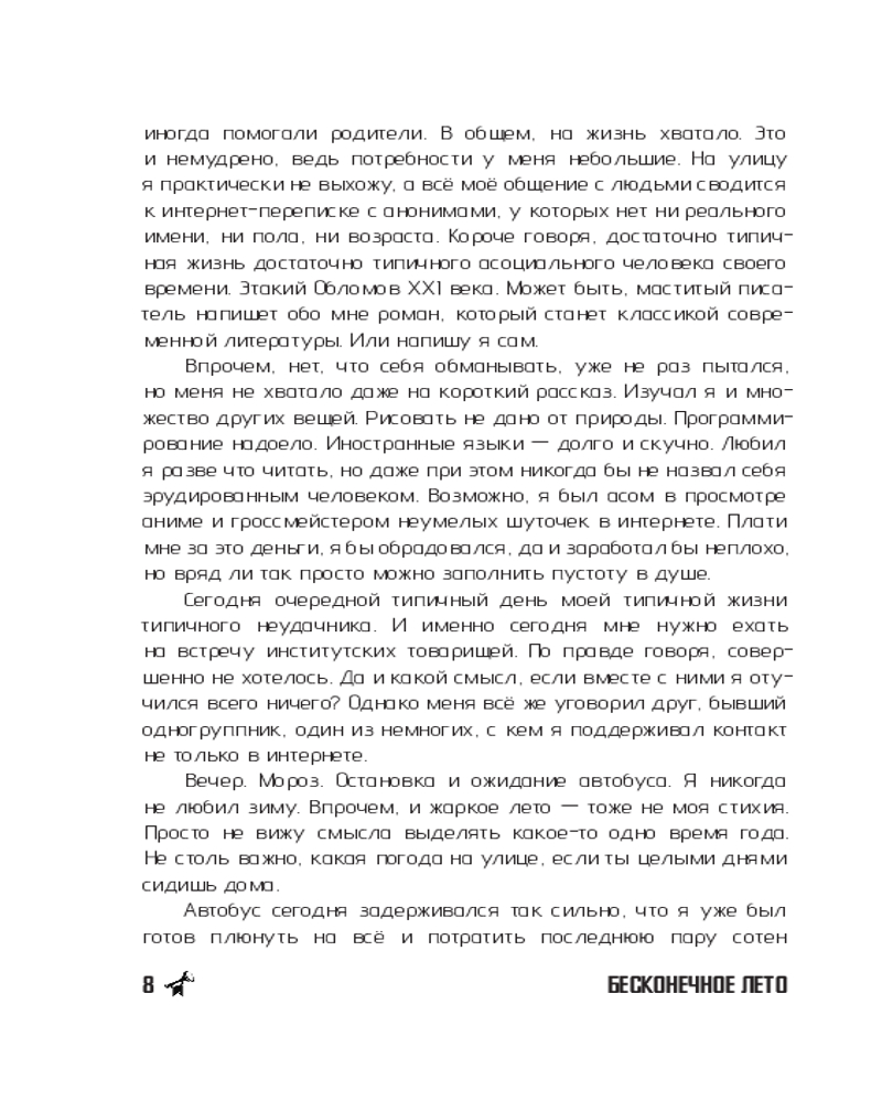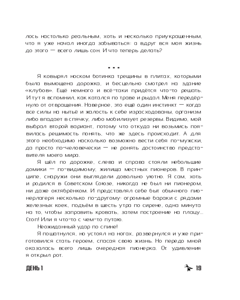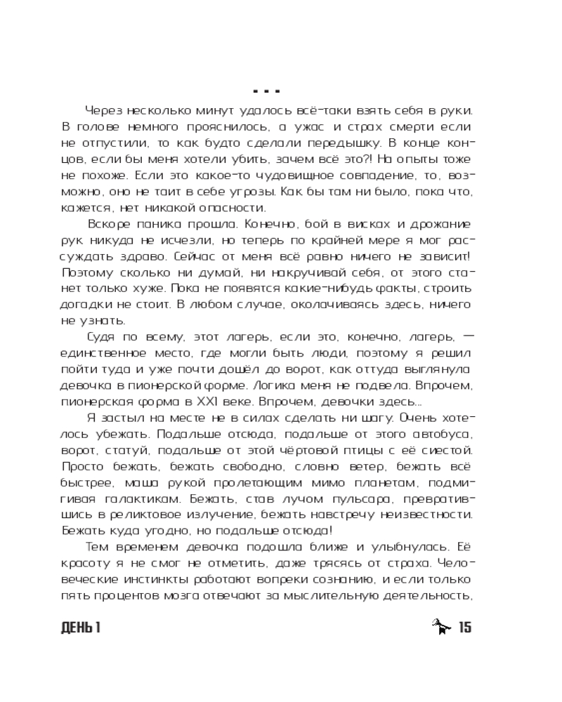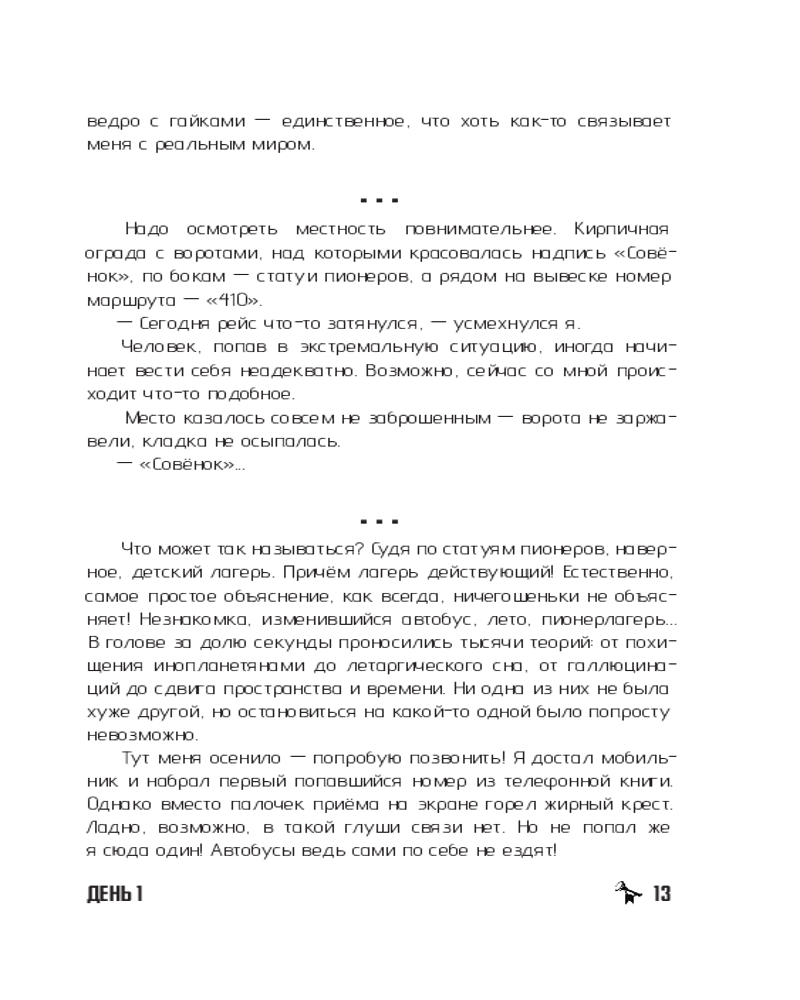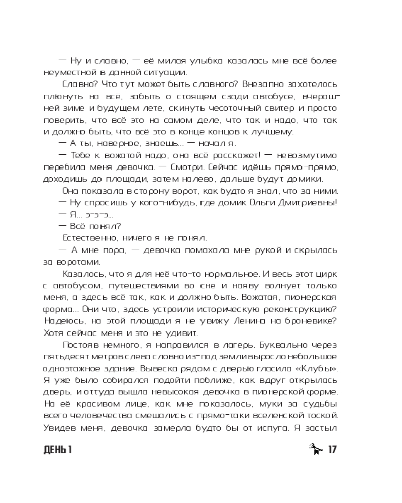 💳 Оплатить за товар можно при получении 🇰🇿 Есть бесплатная доставка по Казахстану от 1 дня 🎁 Копите бонусы с каждой покупки Серия: GameStory Встретив на улице Семёна, главного героя, вы бы никогда не обратили на него внимания — действительно, подобных людей в каждом городе тысячи и даже сотни тысяч. Но однажды с ним приключается совершенно необычное происшествие: он засыпает зимой в автобусе, а просыпается... посреди жаркого лета. Перед ним — пионерлагерь «Совёнок», а позади — прошлая жизнь. |