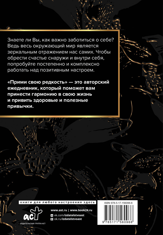💳 Оплатить за товар можно при получении 🇰🇿 Есть бесплатная доставка по Казахстану от 1 дня 🎁 Копите бонусы с каждой покупки Серия: BARTON&BOOKS Знаете ли Вы, как важно заботиться о себе? Ведь весь окружающий мир является зеркальным отражением нас самих. Чтобы обрести счастье снаружи и внутри себя, попробуйте постепенно и комплексно работать над позитивным настроем. «Прими свою редкость» — это авторский ежедневник, который поможет сам принести гармонию в свою жизнь и привить здоровые и полезные привычки. |