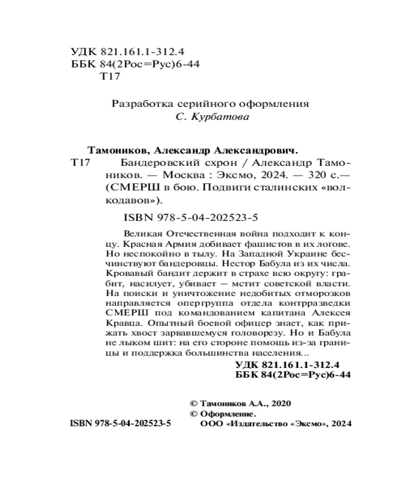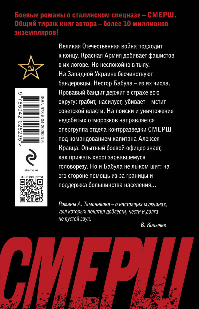 Бандеровский схронАлександр Александрович Тамоников В данный момент этот товар отсутствует в продаже. Возможно, у нас найдется аналогичный или похожий товар здесь. Великая Отечественная война подходит к концу. Красная Армия добивает фашистов в их логове. Но неспокойно в тылу. На Западной Украине бесчинствуют бандеровцы. Нестор Бабула — из их числа. Кровавый бандит держит в страхе всю округу: грабит, насилует, убивает — мстит за советскую власть. На поиски и уничтожение недобитых отморозков направляется опергруппа отдела контрразведки СМЕРШа под командованием капитана Алексея Кравца. Опытный боевой офицер знает, как прижать хвост зарвавшемуся головорезу. Но и Бабула не лыком шит: на его стороне помощь из-за границы и поддержка большинства населения... |