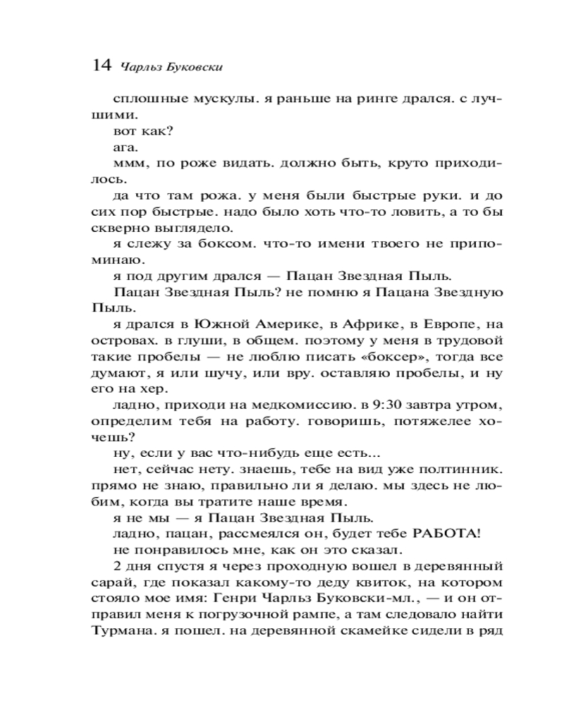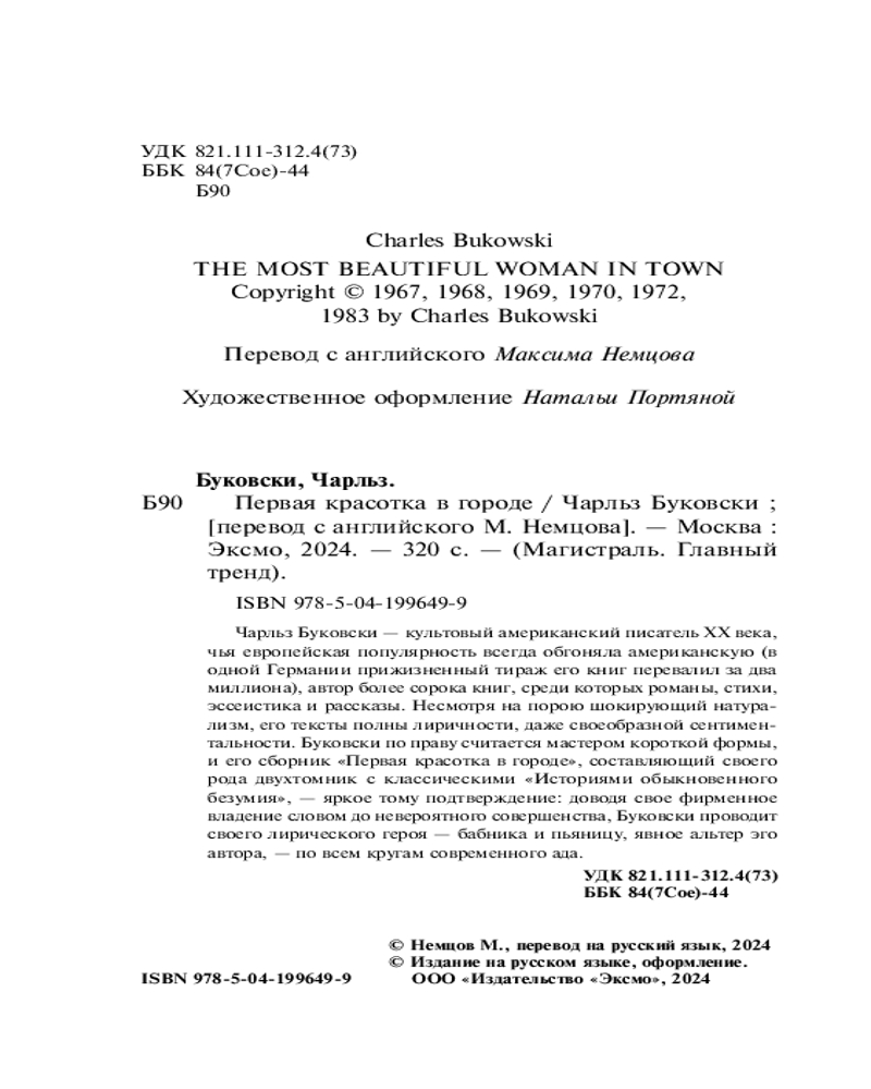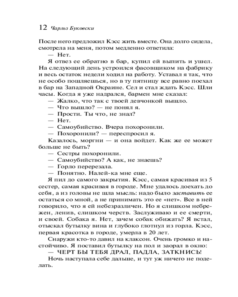 Первая красотка в городеВ данный момент этот товар отсутствует в продаже. Возможно, у нас найдется аналогичный или похожий товар здесь. Серия: Магистраль. Главный тренд Чарльз Буковски — культовый американский писатель XX века, чья европейская популярность всегда обгоняла американскую (в одной Германии прижизненный тираж его книг перевалил за два миллиона), автор более сорока книг, среди которых романы, стихи, эссеистика и рассказы. Несмотря на порою шокирующий натурализм, его тексты полны лиричности, даже своеобразной сентиментальности. Буковски по праву считается мастером короткой формы, и его сборник «Первая красотка в городе», составляющий своего рода двухтомник с классическими «Историями обыкновенного безумия», — яркое тому подтверждение: доводя свое фирменное владение словом до невероятного совершенства, Буковски проводит своего лирического героя — бабника и пьяницу, явное альтер эго автора, — по всем кругам современного ада. |