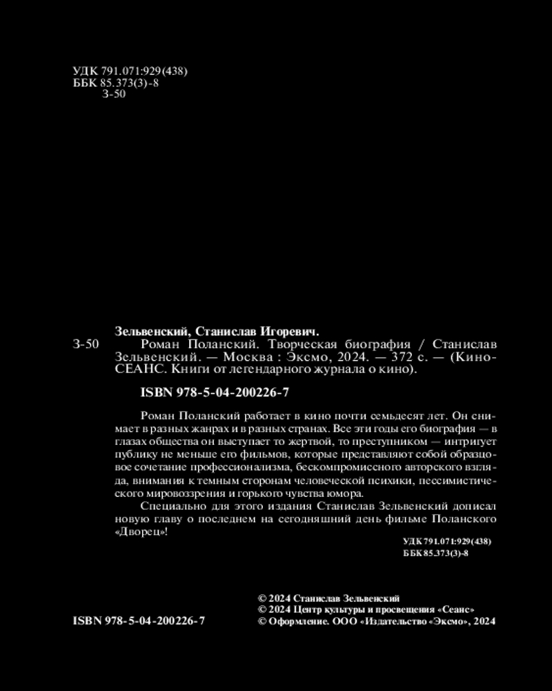 💳 Оплатить за товар можно при получении 🇰🇿 Есть бесплатная доставка по Казахстану 🎁 Копите бонусы с каждой покупки Серия: КиноСЕАНС. Книги от легендарного журнала о кино Роман Поланский — поистине великий режиссёр! Великий и даже скандальный! Ещё ребёнком ему пришлось пройти через ужасы войны и скитаться по приёмным семьям, менять имена, спасаясь от фашизма. Творческая жизнь режиссёра была наполнена триумфами, но личная жизнь — трагедиями. В 1969 году его беременная жена и блестящая актриса Шерон Тейт была зверски убита членами «Семьи» Чарльза Мэнсона. На этом драма, преследующая режиссера, не закончилась. В конце 1970-х ему пришлось бежать из США в Европу после обвинений в изнасиловании несовершеннолетней. Жизнь Поланского — калейдоскоп невероятных событий. А его творчество — отдельный удивительный мир, где царят свои законы. И благодаря этой книге вы окунётесь в этот местами мрачный, но волшебный мир. |