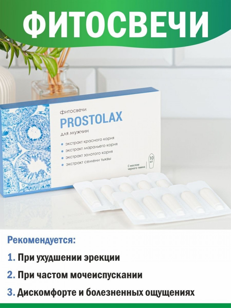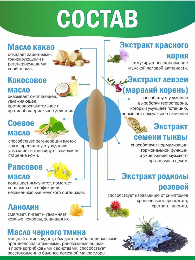 Фито суппозитории на основе растительных экстрактов алтайских трав калгана, радиолы розовой, левзеи, копеечника, с маслом черного тмина и рапсовым маслом. Обладает стимулирующим, тонизирующим и адаптогенным действиями, стимулирует восстановление мужской половой активности, способствует улучшению кровообращения и устранению застойных явлений в предстательной железе. Помогает восстановить работоспособность, способствует усилению выработки тестостерона, который улучшает потенцию, повышает сексуальное влечение. Нормализует гормональную функцию и укрепляет мужской организма в целом. Обладает защитными, тонизирующими и регенерирующими свойствами, стимулирует процессы обновления клеток, при соприкосновении с кожей быстро тает и впитывается, донося активные вещества глубоко в ткани. Стимулирует обменные процессы, препятствует развитию венозного застоя в органах малого таза, укрепляет сосуды, повышает эластичность стенок кавернозных тел, эрекция становится более уверенной, препятствует развитию инфекционных воспалений, в том числе простатита, уретрита, орхита, усиливает либидо, помогает при стрессовых нарушениях потенции, оказывает противоотечное и противоопухолевое действие, за счет чего облегчает симптомы аденомы простаты. Улучшает микрофлору кишечника.