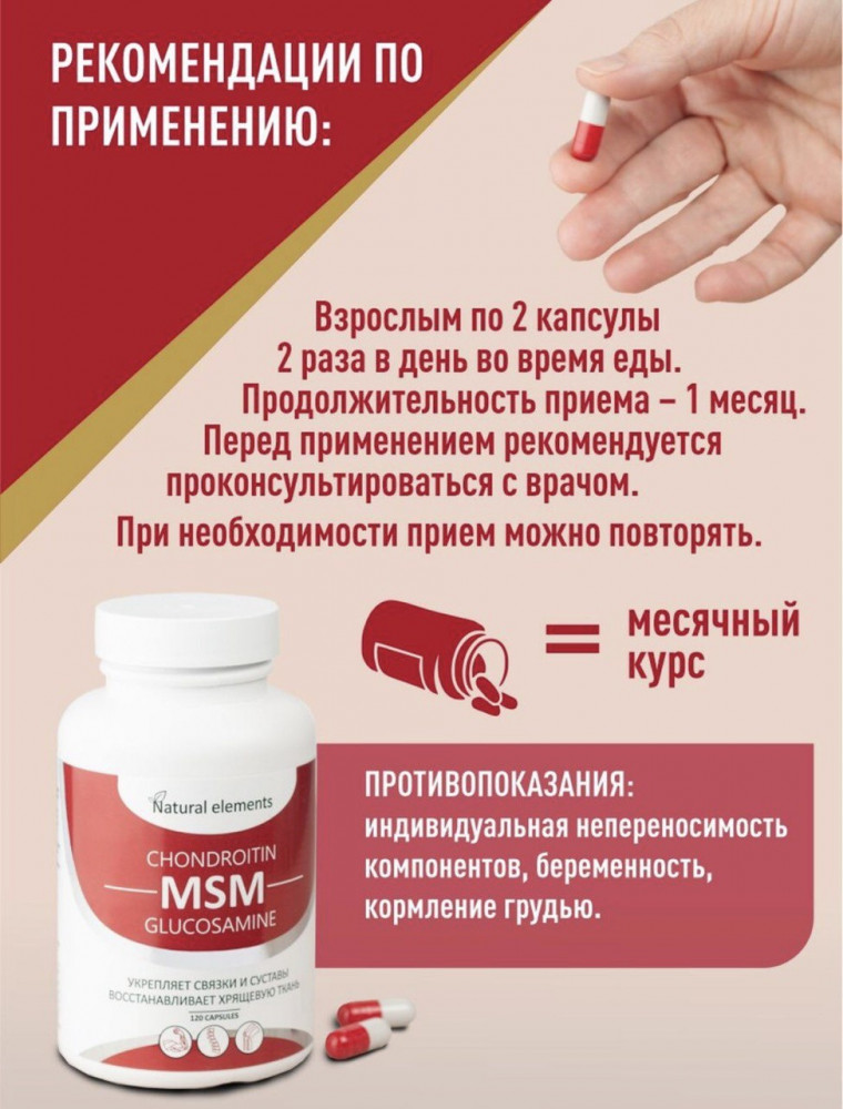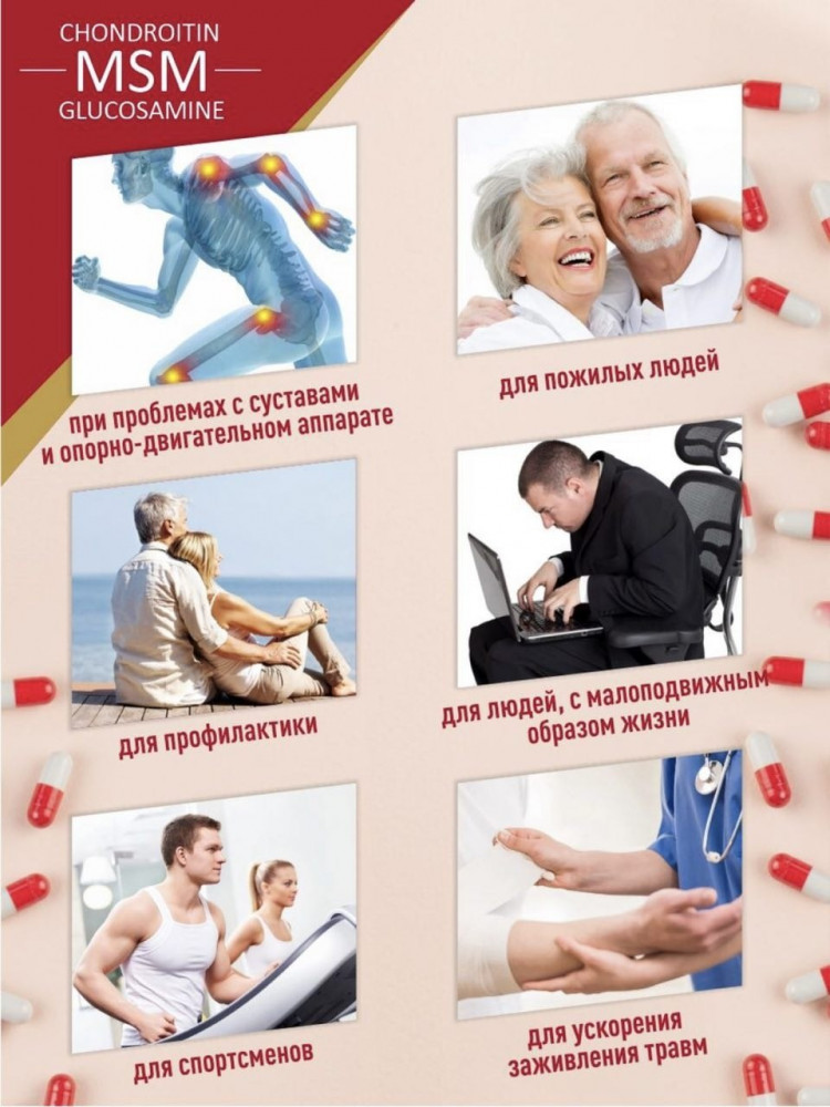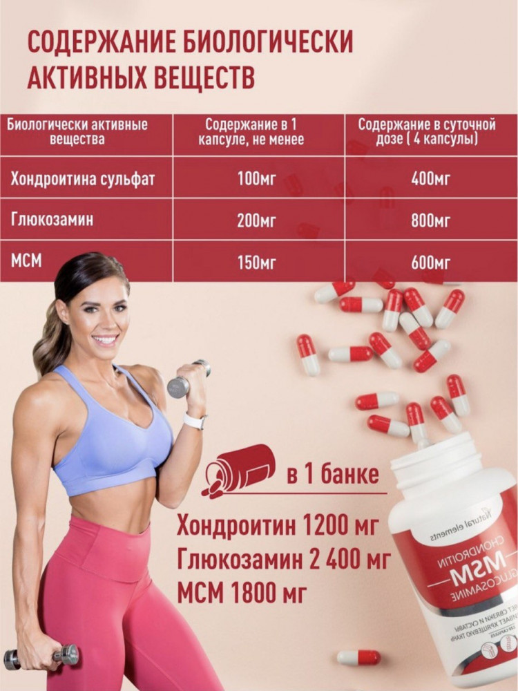 • источник хондоитинсульфата, глюкозамина, содержит метилсульфонилметан.