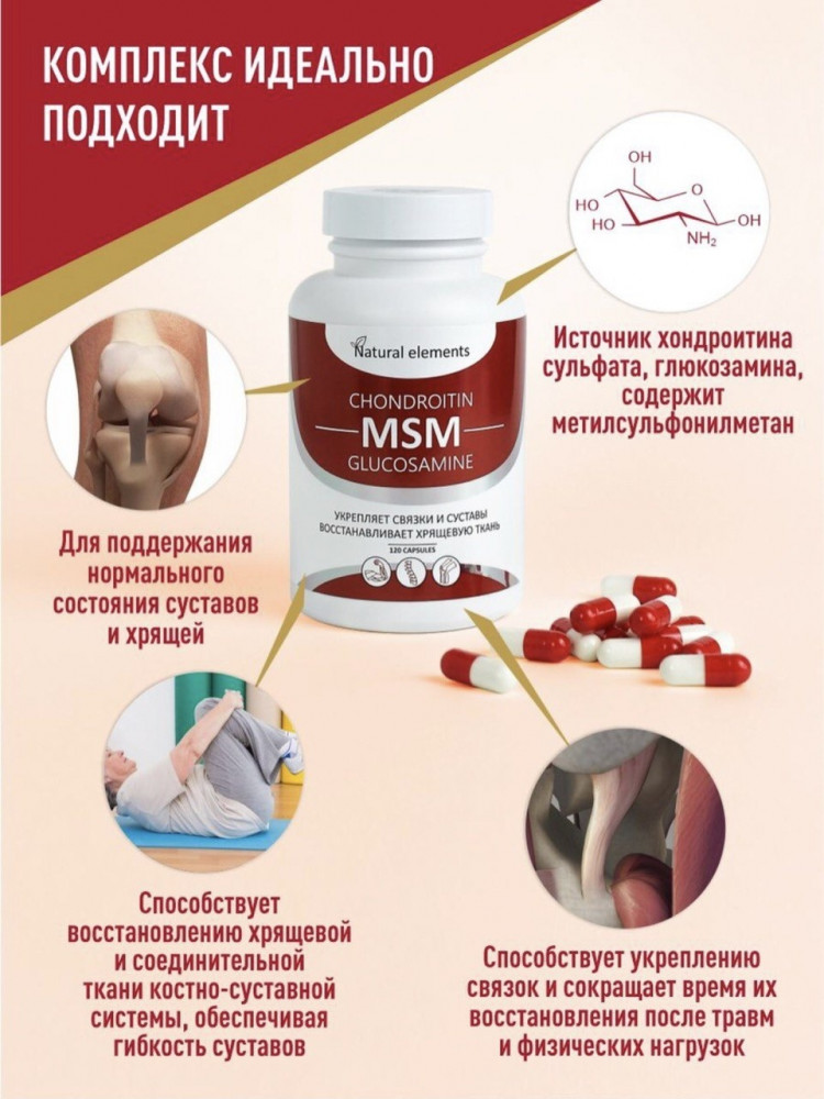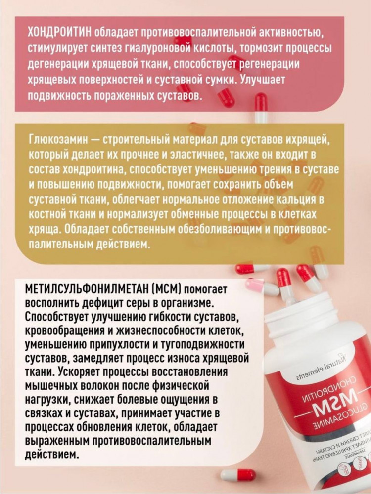 Комплекс «Хондроитин + Глюкозамин + МСМ» способствует восстановлению хрящевой и соединительной ткани костно-суставной системы, обеспечивая гибкость суставов, способствует укреплению связок и сокращает время их восстановления после травм и физических нагрузок.