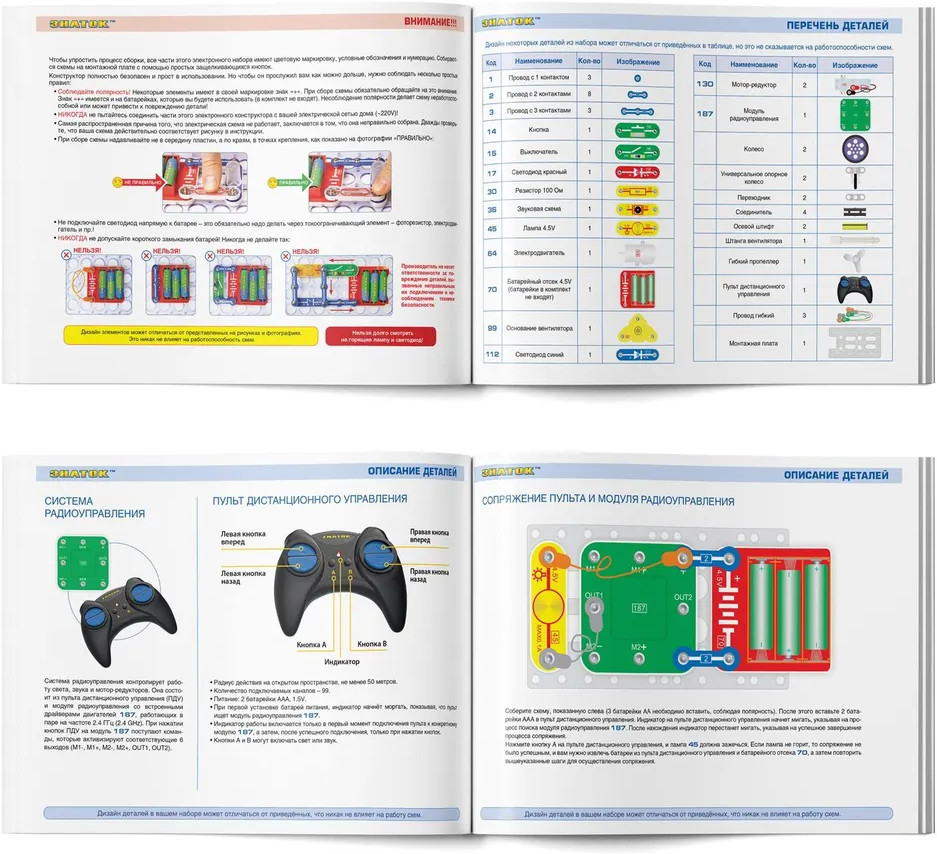 Знаток Конструктор электронный «Радиоуправляемая машинка»В данный момент этот товар отсутствует в продаже. Возможно, у нас найдется аналогичный или похожий товар здесь. Радиоуправляемая машинка «Ветерок» позволит по-новому взглянуть на процесс обучения и проникнуться любовью к физике и электронике! Уникальная возможность самостоятельно собрать трицикл с подсветкой или машинку с музыкальным сопровождением. Собираем схемы с лампочкой, светодиодами и вентилятором. Изучаем звуковую индикацию и световую индикацию, последовательное и параллельное соединения потребителей. Знакомимся с принципом работы генератора с помощью мотор-редукторов. Яркое и понятное руководство поможет ребёнку собрать и испытать схему! Пульт дистанционного управления рассчитан на 99 каналов, что позволяет проводить соревнования с большим количеством участников. |