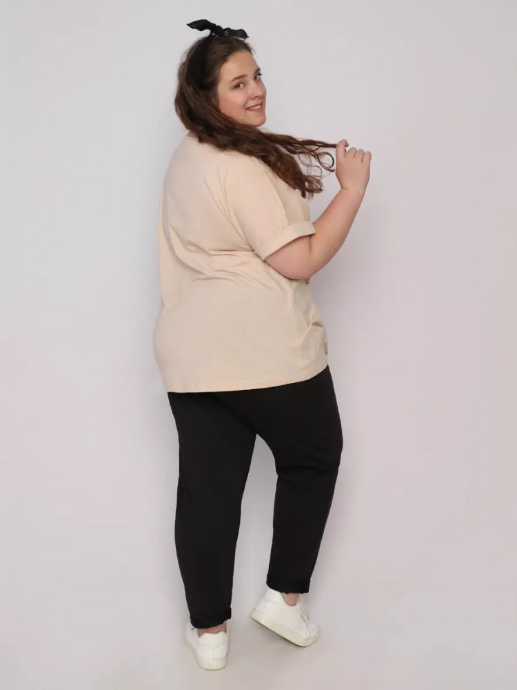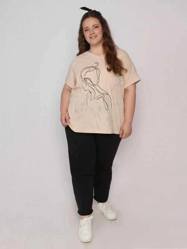 Красивая ,хорошо сшитая футболка. Ткань приятная к телу,хлопок. Крой свободный,вырез глубокий. Брала 54,свободновато,наверное,можно попробовать и 52 размер. Хотя хлопок дает усадку после стирки и возможно будет уже не так свободно. Спасибо за товар и за доставку,товаром довольна.