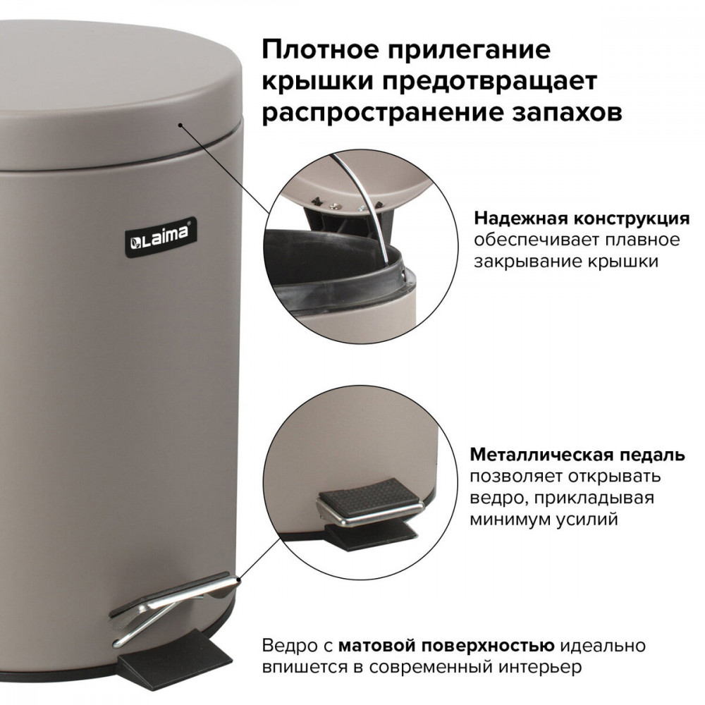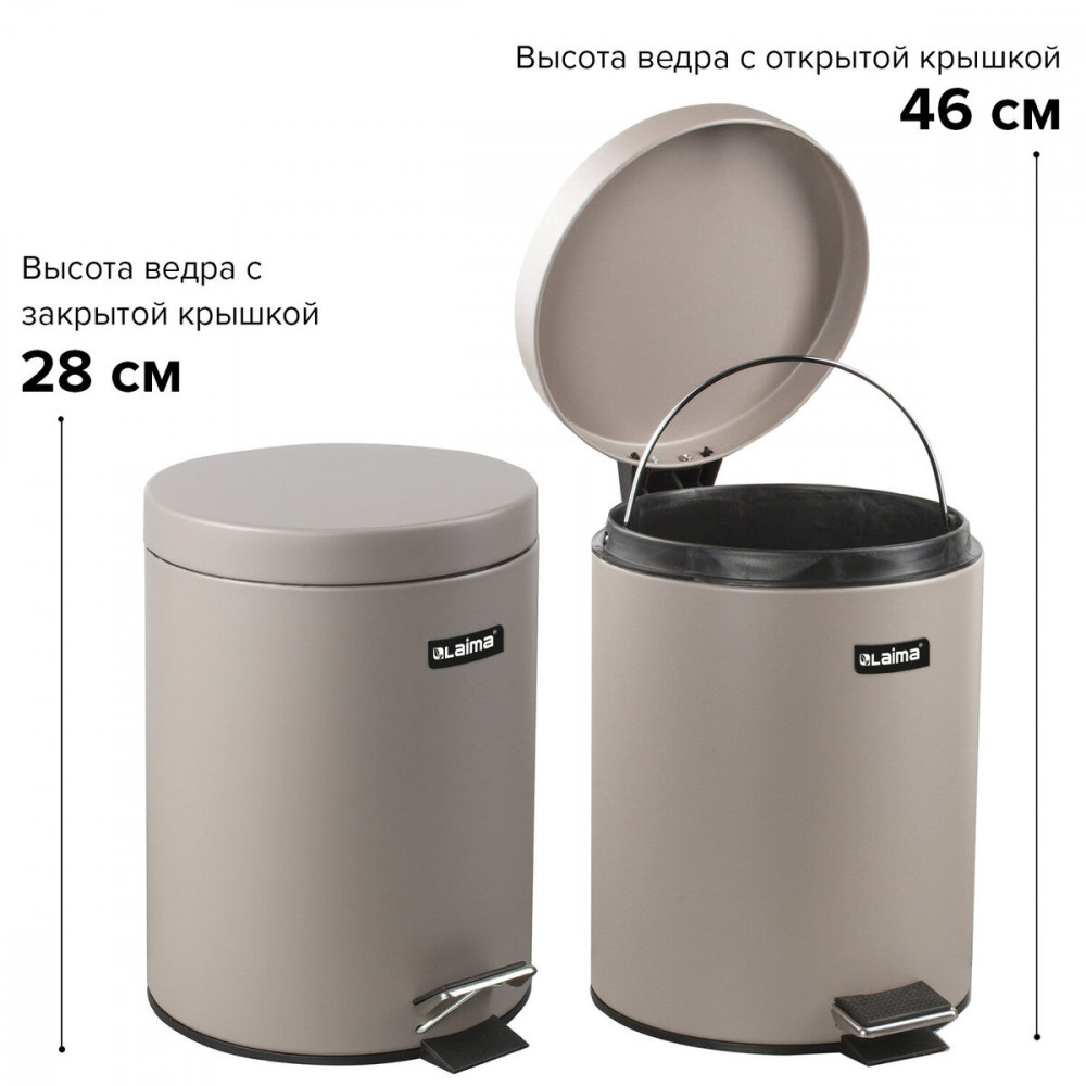 Ведро-контейнер для мусора ЛАЙМА «Classic» предназначено для утилизации отходов, помогает поддерживать порядок и чистоту как в офисном помещении, так и на предприятиях и в различных учреждениях. 5 л — подходящий объем при небольшой проходимости. Оборудовано педалью для открывания. Крышка плотно прилегает, тем самым препятствуя распространению запахов. Внутреннее съемное пластиковое ведро имеет удобную рукоятку для извлечения. Изготовлено из нержавеющей стали со специальным антикоррозийным покрытием, что обеспечивает максимально долгий срок службы. Ведро устойчиво благодаря антискользящему основанию. Объем рекомендуемого мешка — 10 л. Контейнер для мусора в сером цвете с матовым покрытием имеет компактные размеры (28×20,5×20,5 см) и отлично впишется в любой интерьер.